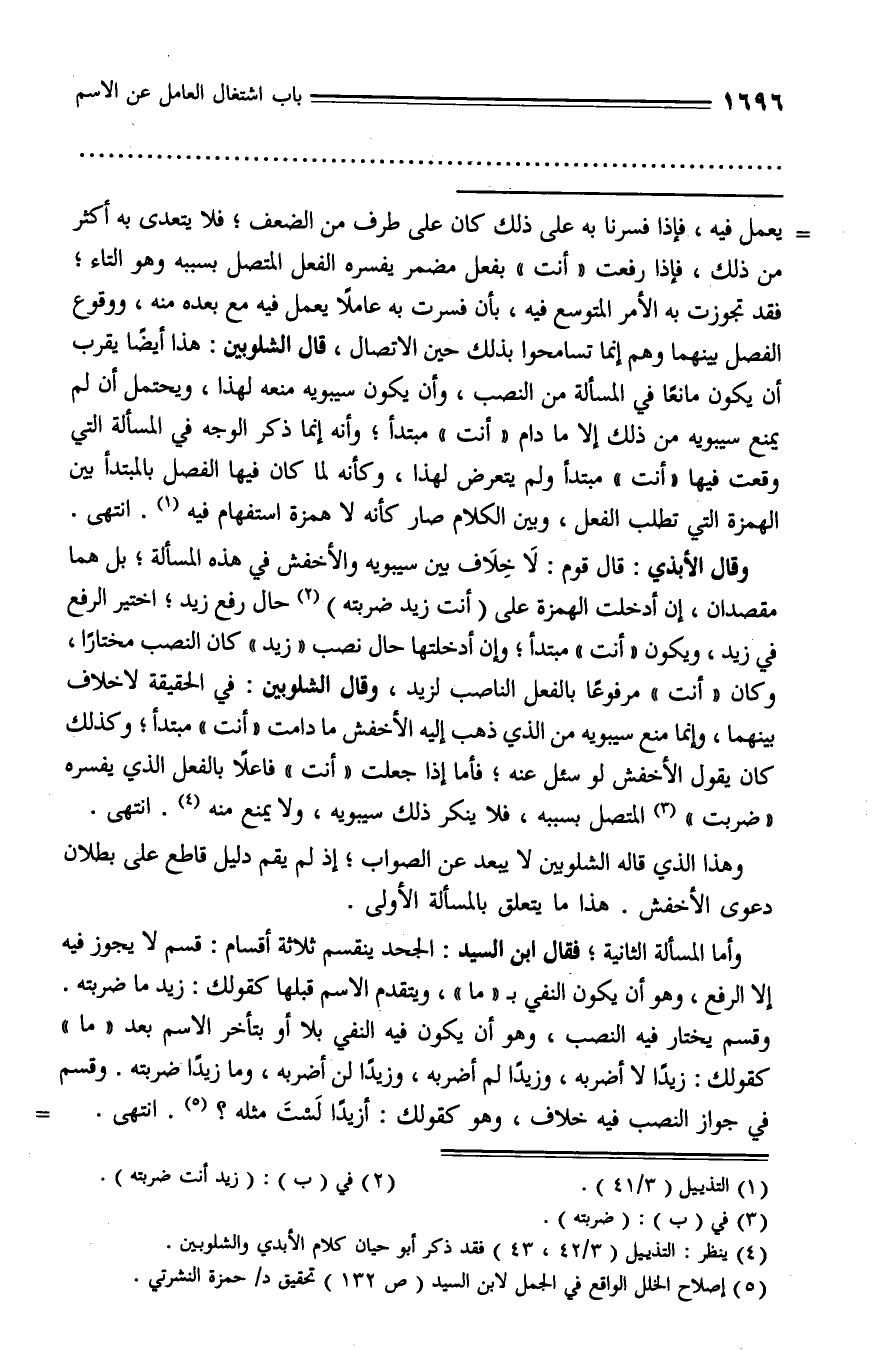 (¬4) ينظر: التذييل (3/ 42، 43) فقد ذكر أبو حيان كلام الأبدي والشلوبين.