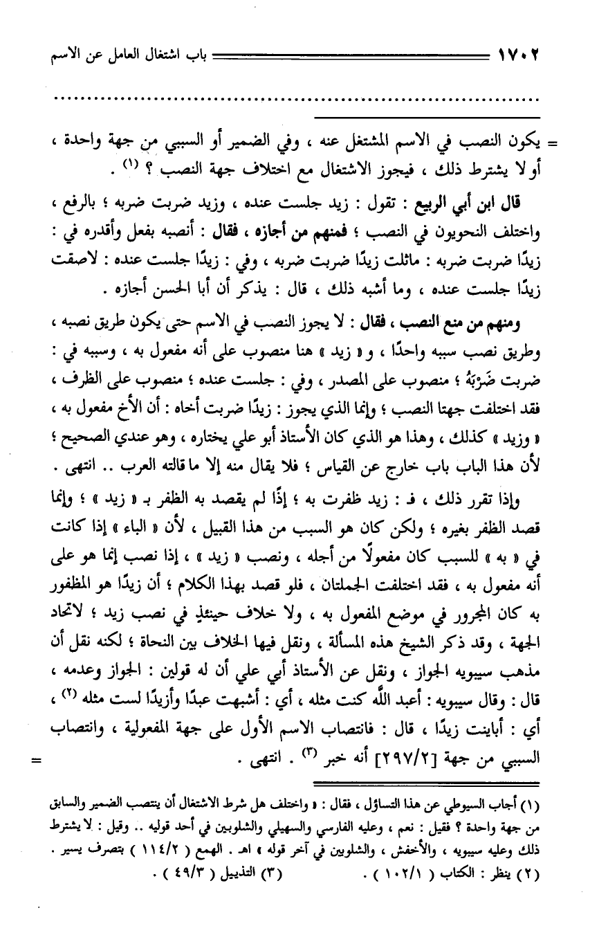 (¬1) أجاب السيوطي عن هذا التساؤل، فقال: «واختلف هل شرط الاشتغال أن ينتصب الضمير والسابق من جهة واحدة؟ فقيل: نعم، وعليه الفارسي والسهيلي والشلوبين في أحد قوليه .. وقيل: لا يشترط ذلك وعليه سيبويه، والأخفش، والشلوبين في آخر قوله» اه. الهمع (2/ 114) بتصرف يسير.