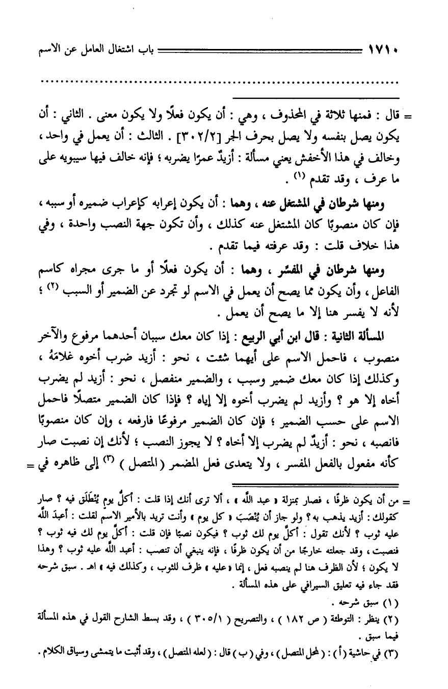 قال: فمنها ثلاثة في المحذوف، وهي: أن يكون فعلا ولا يكون معنى. الثاني: أن يكون يصل بنفسه ولا يصل بحرف الجر [2/ 302]. الثالث: أن يعمل في واحد، وخالف في هذا الأخفش يعني مسألة: أزيد عمرا يضربه؛ فإنه خالف فيها سيبويه على ما عرف، وقد تقدم (¬1).