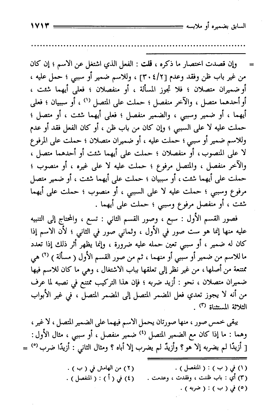 يبقى خمس صور، منها صورتان يحمل الاسم فيهما على الضمير المتصل، لا غير، وهما: ما إذا كان مع الضمير المتصل (¬4) ضمير منفصل، أو سببي، مثال الأول: