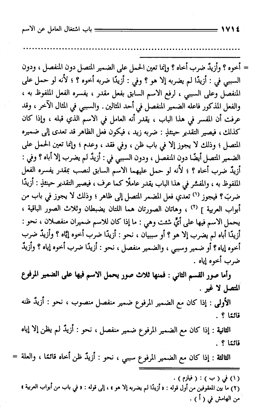 أزيد ضرب أخاه؟؛ لأنه لو حمل عليهما الاسم السابق لنصب بمقدر يفسره الفعل الملفوظ به، والمفسّر في هذا الباب يقدر عاملا كما عرف، فيصير التقدير حينئذ: أزيدا ضرب؟ فيجوز (¬1) تعدي فعل المضمر المتصل إلى ظاهر؛ وذلك لا يجوز في باب من أبواب العربية] (¬2)، وهاتان الصورتان هما اللتان يضبطان وثلاث الصور الباقية، يحمل الاسم فيها على أيّ شئت وهي: ما إذا كان للاسم ضميران منفصلان، نحو: