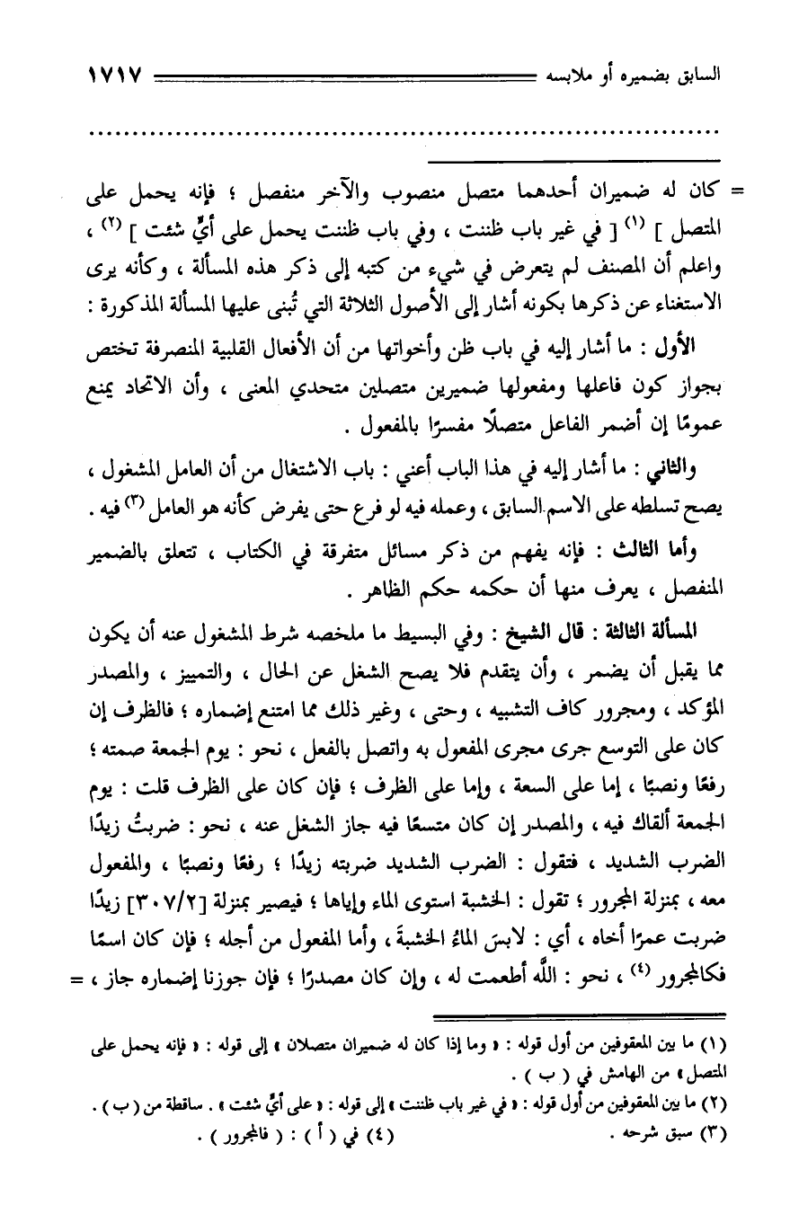 الأول: ما أشار إليه في باب ظن وأخواتها من أن الأفعال القلبية المنصرفة تختص بجواز كون فاعلها ومفعولها ضميرين متصلين متحدي المعنى، وأن الاتحاد يمنع عموما إن أضمر الفاعل متصلا مفسرا بالمفعول.