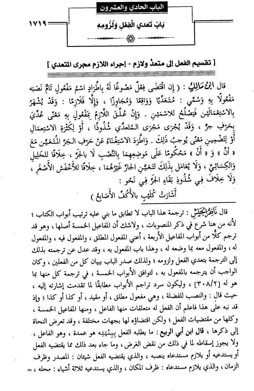 قال ابن مالك: (ان اقتضى فعل مصوغا له باطّراد اسم مفعول تامّ نصبه مفعولا به وسمّي: متعدّيا وواقعا ومجاوزا، وإلّا فلازما: وقد يشهر بالاستعمالين فيصلح للاسمين. وإن علّق اللّازم بمفعول به معنى عدّي بحرف جرّ، وقد يجرى مجرى المتعدّي شذوذا، أو لكثرة الاستعمال أو لتضمين معنى يوجب ذلك. واطّرد الاستغناء عن حرف الجرّ المتعيّن مع «أنّ» و «أن» محكوما على موضعهما بالنّصب لا بالجرّ، خلافا للخليل والكسائيّ، ولا يعامل بذلك لتعيّن الجارّ غيرهما، خلافا للأخفش الأصغر، ولا خلاف في شذوذ بقاء الجرّ في نحو: