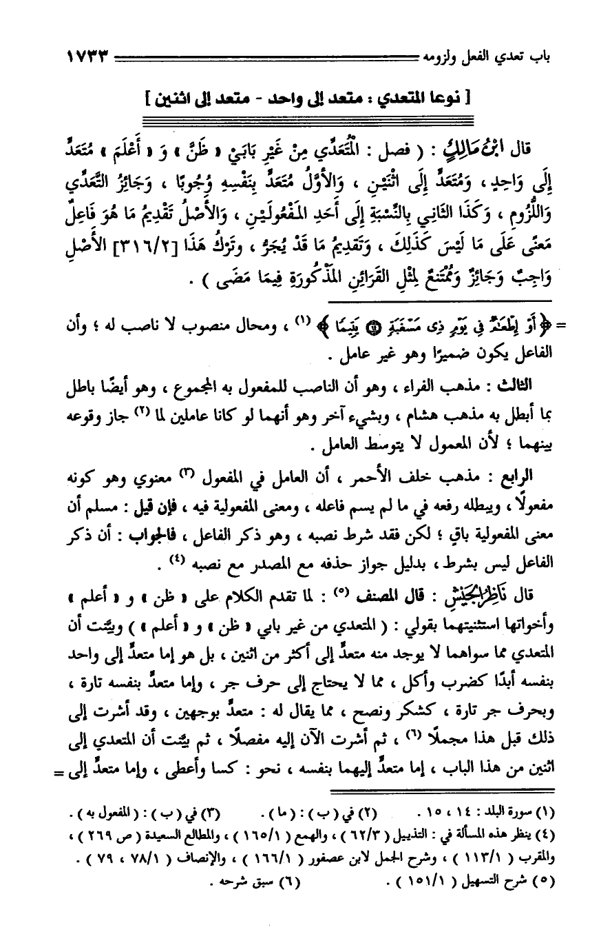 قال ابن مالك: (فصل: المتعدّي من غير بابي «ظنّ» و «أعلم» متعدّ إلى واحد، ومتعدّ إلى اثنين، والأوّل متعدّ بنفسه وجوبا، وجائز التّعدّي واللّزوم، وكذا الثاني بالنّسبة إلى أحد المفعولين، والأصل تقديم ما هو فاعل معنى على ما ليس كذلك، وتقديم ما قد يجرّ، وترك هذا [2/ 316] الأصل واجب وجائز وممتنع لمثل القرائن المذكورة فيما مضى).