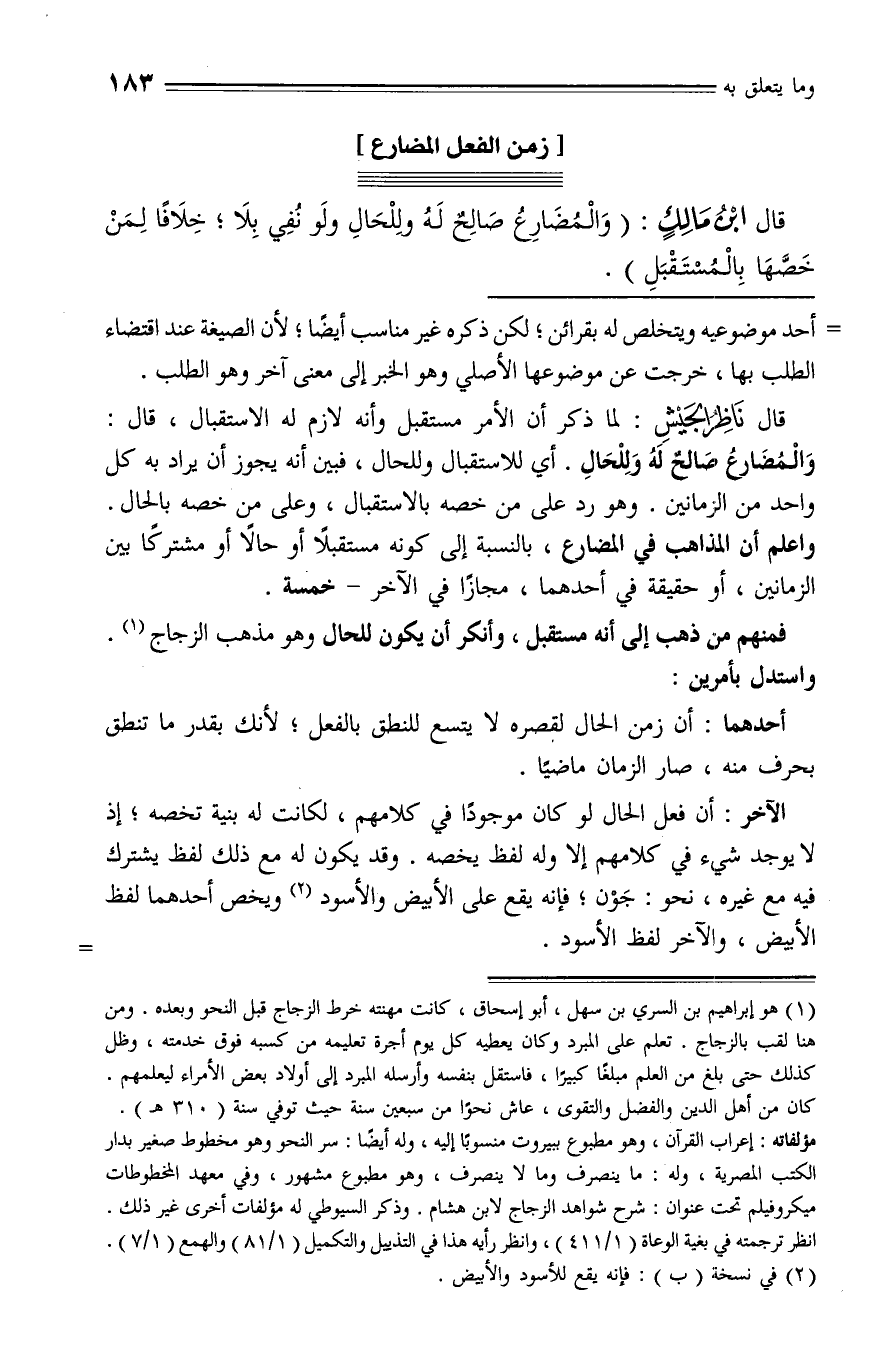 (¬1) هو إبراهيم بن السري بن سهل، أبو إسحاق، كانت مهنته خرط الزجاج قبل النحو وبعده. ومن هنا لقب بالزجاج. تعلم على المبرد وكان يعطيه كل يوم أجرة تعليمه من كسبه فوق خدمته، وظل كذلك حتى بلغ من العلم مبلغا كبيرا، فاستقل بنفسه وأرسله المبرد إلى أولاد بعض الأمراء ليعلمهم.