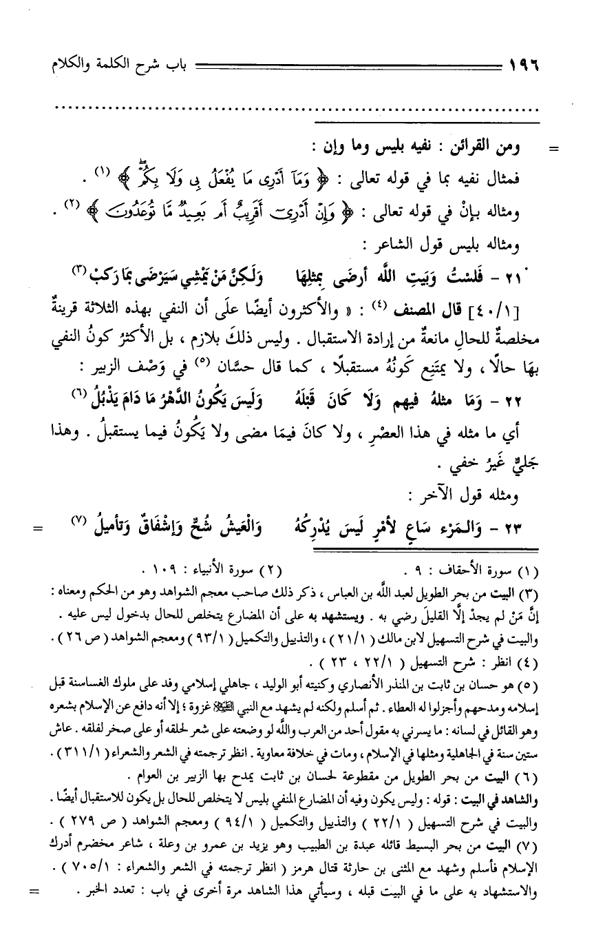 [1/ 40] قال المصنف (¬4): «والأكثرون أيضا على أن النفي بهذه الثلاثة قرينة مخلصة للحال مانعة من إرادة الاستقبال. وليس ذلك بلازم، بل الأكثر كون النفي بها حالا، ولا يمتنع كونه مستقبلا، كما قال حسّان (¬5) في وصف الزبير: