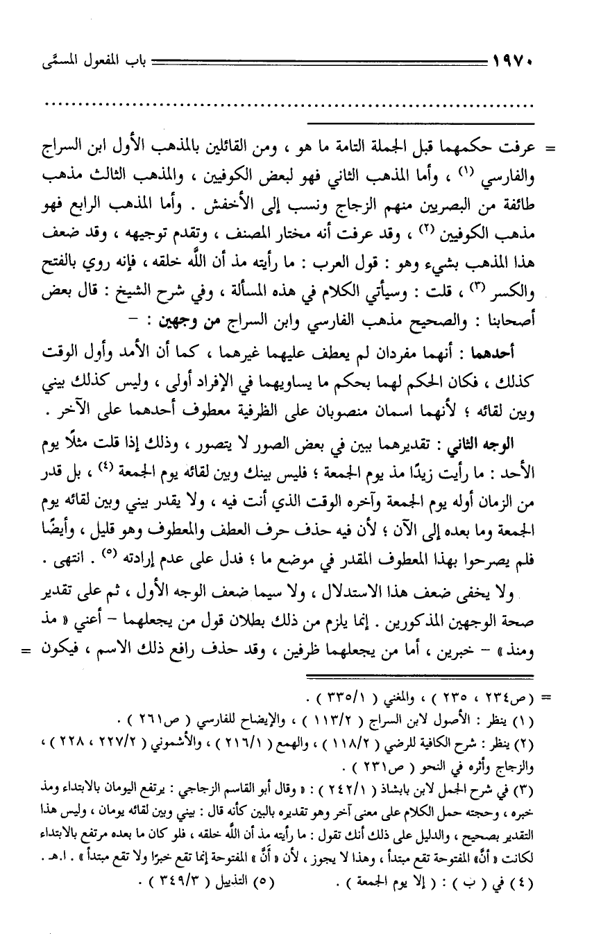 (¬3) في شرح الجمل لابن بابشاذ (1/ 242): «وقال أبو القاسم الزجاجي: يرتفع اليومان بالابتداء ومذ خبره، وحجته حمل الكلام على معنى آخر وهو تقديره بالبين كأنه قال: بيني وبين لقائه يومان، وليس هذا التقدير بصحيح، والدليل على ذلك أنك تقول: ما رأيته مذ أن الله خلقه، فلو كان ما بعده مرتفع بالابتداء لكانت «أنّ» المفتوحة تقع مبتدأ، وهذا لا يجوز، لأن «أنّ» المفتوحة إنما تقع خبرا ولا تقع مبتدأ». ا. هـ.