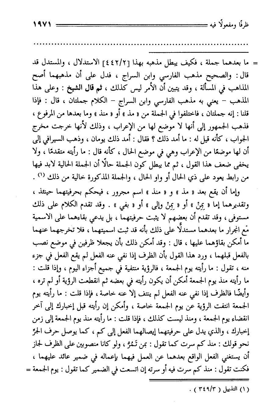وإما أن يقع بعد «مذ» و «منذ» اسم مجرور، فيحكم بحرفيتهما حينئذ، وتقديرهما إما «بمن» أو «بمن وإلى» أو «بفي». وقد تقدم الكلام على ذلك مستوفى، وقد تقدم أن بعضهم لا يثبت حرفيتهما، بل يدعي بقاءهما على الاسمية مع انجرار ما بعدهما مستدلّا على ذلك بأنه قد ثبت اسميتهما، فلا تخرجهما عنهما ما أمكن بقاؤهما عليها، قال: وقد أمكن ذلك بأن يجعلا ظرفين في موضع نصب بالفعل قبلهما، ورد هذا القول بأن الظرف إذا نفي عنه الفعل لم يقع الفعل في جزء منه، تقول: ما رأيته يوم الجمعة، فالرؤية منتفية في جميع أجزاء اليوم، وإذا قلت: