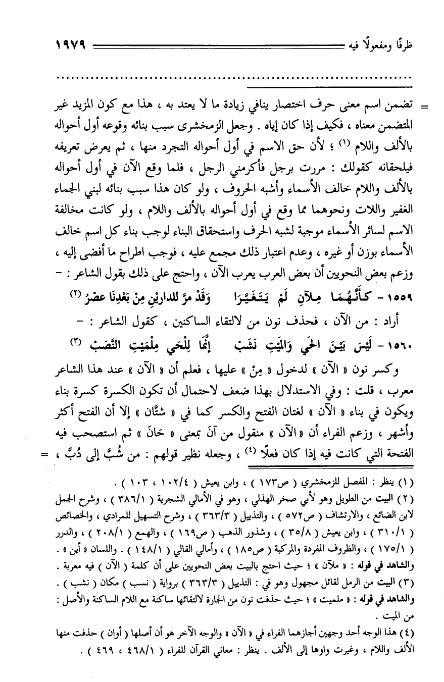 وكسر نون «الآن» لدخول «من» عليها، فعلم أن «الآن» عند هذا الشاعر معرب، قلت: وفي الاستدلال بهذا ضعف لاحتمال أن تكون الكسرة كسرة بناء ويكون في بناء «الآن» لغتان الفتح والكسر كما في «شتّان» إلا أن الفتح أكثر وأشهر، وزعم الفراء أن «الآن» منقول من آن بمعنى «حان» ثم استصحب فيه الفتحة التي كانت فيه إذا كان فعلا (¬4)، وجعله نظير قولهم: من شبّ إلى دبّ، -