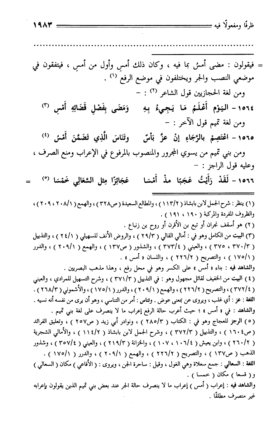 (¬3) البيت من الكامل وهو في: أمالي القالي (3/ 29)، والروض الأنف للسهيلي (1/ 24)، والتذييل (3/ 370، 375)، والعيني (4/ 373)، والشذور (ص 137)، والهمع (1/ 209)، والدرر (1/ 175)، والتصريح (2/ 226)، واللسان «أمس».