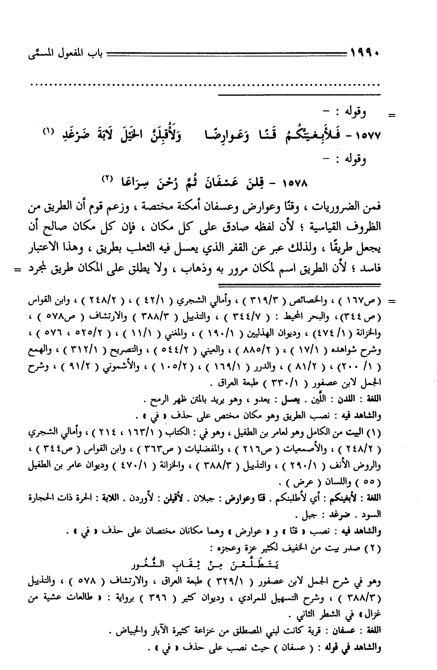 والشاهد فيه: نصب «قنا» و «عوارض» وهما مكانان مختصان على حذف «في».