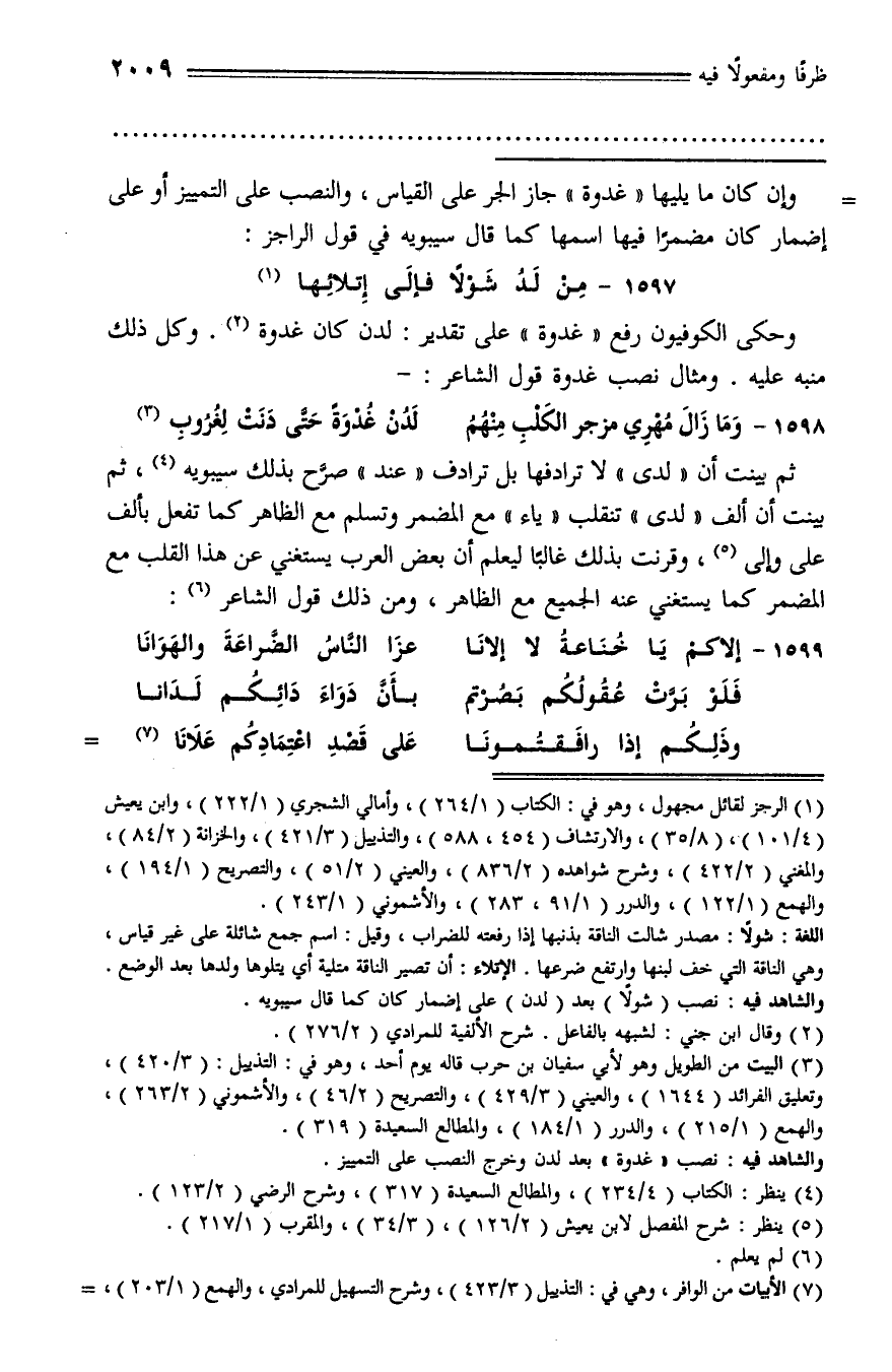 ثم بينت أن «لدى» لا ترادفها بل ترادف «عند» صرّح بذلك سيبويه (¬4)، ثم بينت أن ألف «لدى» تنقلب «ياء» مع المضمر وتسلم مع الظاهر كما تفعل بألف على وإلى (¬5)، وقرنت بذلك غالبا ليعلم أن بعض العرب يستغني عن هذا القلب مع المضمر كما يستغني عنه الجميع مع الظاهر، ومن ذلك قول الشاعر (¬6):