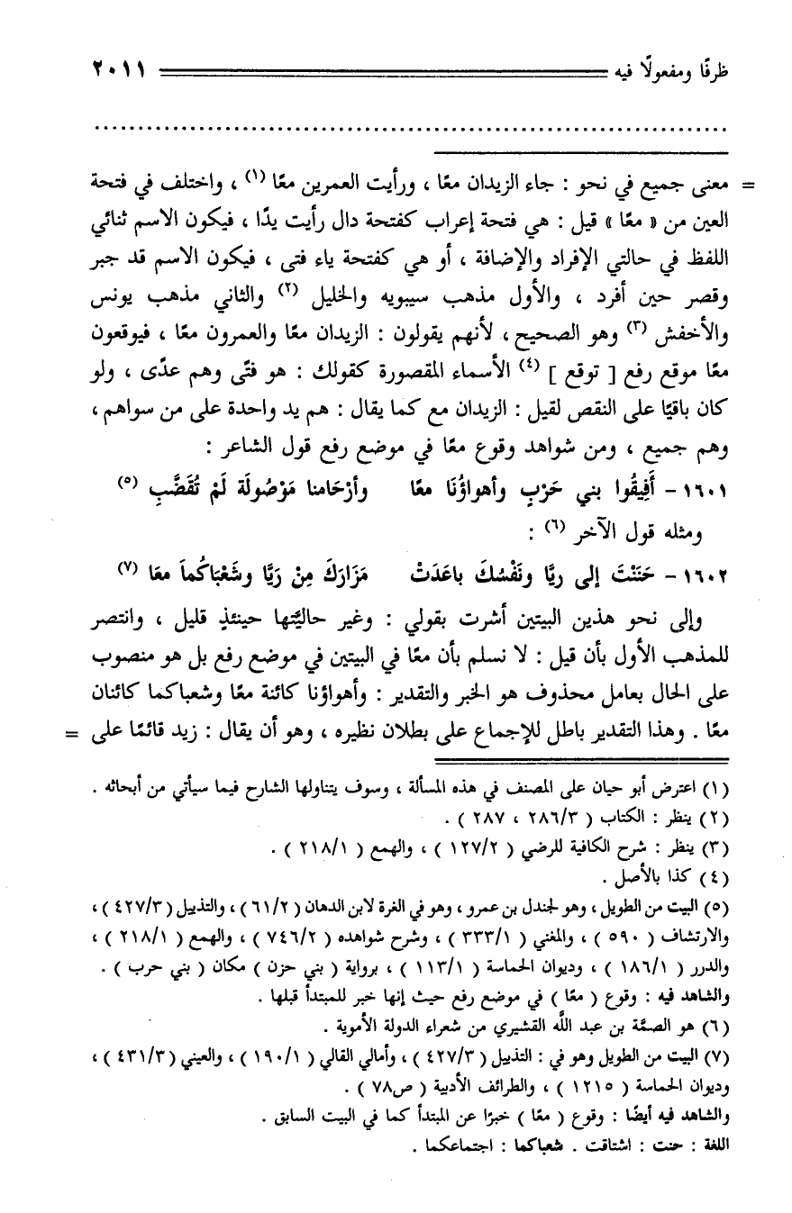 معنى جميع في نحو: جاء الزيدان معا، ورأيت العمرين معا (¬1)، واختلف في فتحة العين من «معا» قيل: هي فتحة إعراب كفتحة دال رأيت يدا، فيكون الاسم ثنائي اللفظ في حالتي الإفراد والإضافة، أو هي كفتحة ياء فتى، فيكون الاسم قد جبر وقصر حين أفرد، والأول مذهب سيبويه والخليل (¬2) والثاني مذهب يونس والأخفش (¬3) وهو الصحيح، لأنهم يقولون: الزيدان معا والعمرون معا، فيوقعون معا موقع رفع [توقع] (¬4) الأسماء المقصورة