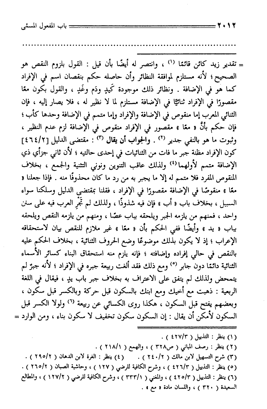 (¬6) ينظر: التذييل (3/ 425)، والمغني (1/ 333)، وشرح الكافية للرضي (2/ 127)، والمطالع السعيدة (320)، واللسان مادة «مع».