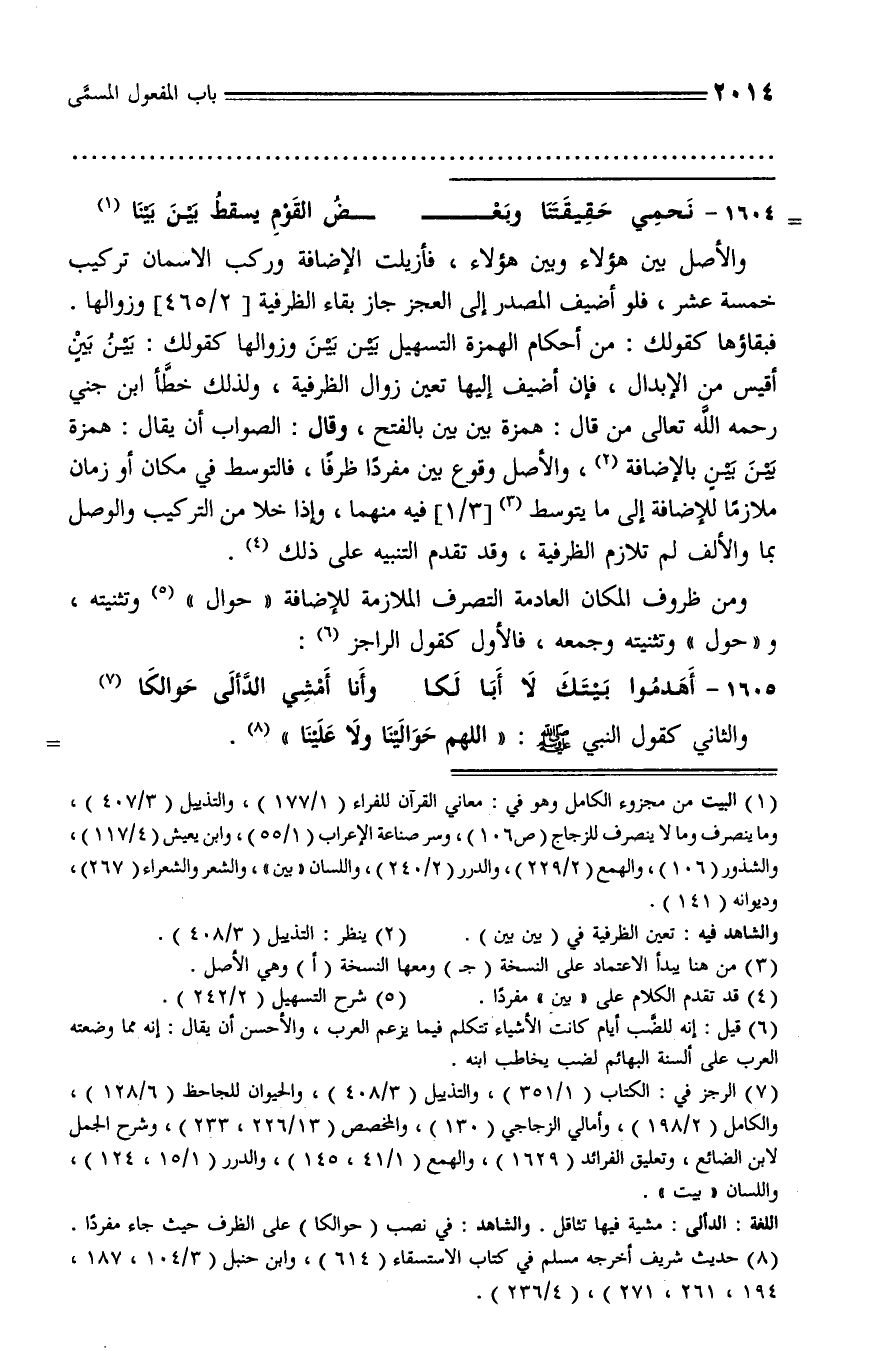 فبقاؤها كقولك: من أحكام الهمزة التسهيل بين بين وزوالها كقولك: بين بين أقيس من الإبدال، فإن أضيف إليها تعين زوال الظرفية، ولذلك خطّأ ابن جني رحمه الله تعالى من قال: همزة بين بين بالفتح، وقال: الصواب أن يقال: همزة بين بين بالإضافة (¬2)، والأصل وقوع بين مفردا ظرفا، فالتوسط في مكان أو زمان ملازما للإضافة إلى ما يتوسط (¬3) [3/ 1] فيه منهما، وإذا خلا من التركيب والوصل بما والألف لم تلازم الظرفية، وقد تقدم التنبيه على ذلك (¬4).