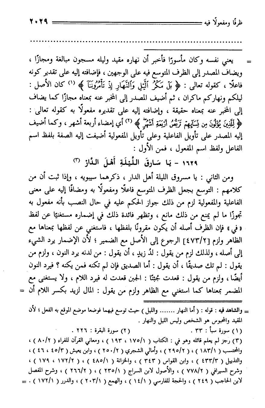 ومن الثاني: يا مسروق الليلة أهل الدار، ذكرهما سيبويه، وإذا ثبت أن من كلامهم: التوسع بجعل الظرف المتوسع فاعلا ومفعولا به ومضافا إليه على معنى الفاعلية والمفعولية لزم من ذلك جواز الحكم عليه في حال النصب بأنه مفعول به تجوزا ما لم يمنع من ذلك مانع، وتظهر فائدة ذلك في إضماره مستغنيا عن لفظ «في» فإن الظرف أصله أن يكون مقرونا بلفظها، فاستغني عن لفظها بمعناها مع الظاهر ولزم [2/ 473] الرجوع إلى الأصل مع الضمير؛ لأن الإضمار يرد الشيء إلى أصله، ولذلك لزم من يقول: لد زيد، أن يقول: من لدنه يرد النون، ولزم من يقول: لم تك صديقا، أن يقول: أما الصديق فإن لم تكنه فمن يكنه؟ فيرد النون أيضا، ولزم من يقول: قعدت جبنا: