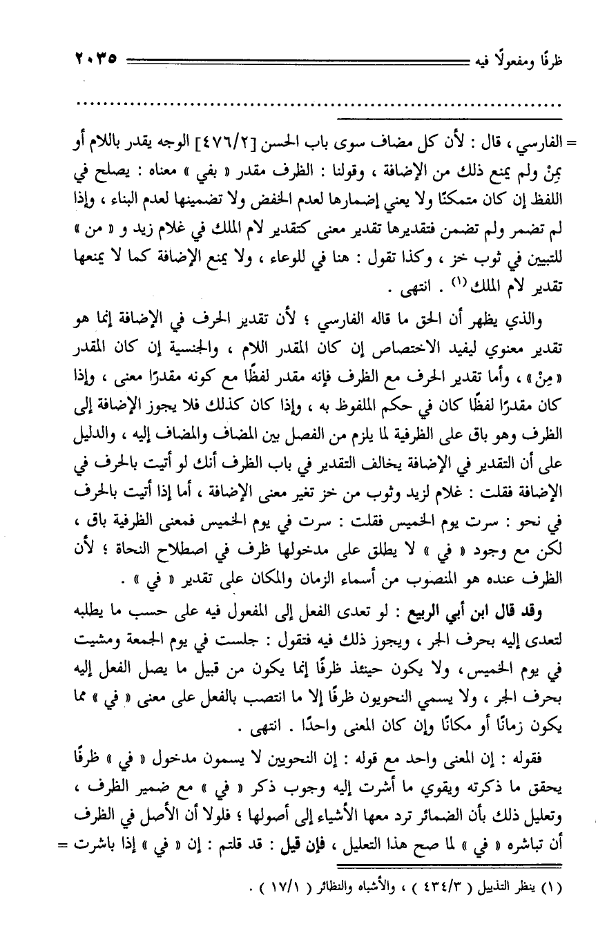 والذي يظهر أن الحق ما قاله الفارسي؛ لأن تقدير الحرف في الإضافة إنما هو تقدير معنوي ليفيد الاختصاص إن كان المقدر اللام، والجنسية إن كان المقدر «من»، وأما تقدير الحرف مع الظرف فإنه مقدر لفظا مع كونه مقدرا معنى، وإذا كان مقدرا لفظا كان في حكم الملفوظ به، وإذا كان كذلك فلا يجوز الإضافة إلى الظرف وهو باق على الظرفية لما يلزم من الفصل بين المضاف والمضاف إليه، والدليل على أن التقدير في الإضافة يخالف التقدير في باب الظرف أنك لو أتيت بالحرف في الإضافة فقلت: غلام لزيد وثوب من خز تغير معنى الإضافة، أما إذا أتيت بالحرف في نحو: سرت يوم الخميس فقلت: سرت في يوم الخميس فمعنى الظرفية باق، لكن مع وجود «في» لا يطلق على مدخولها ظرف في اصطلاح النحاة؛ لأن الظرف عنده هو المنصوب من أسماء الزمان والمكان على تقدير «في».