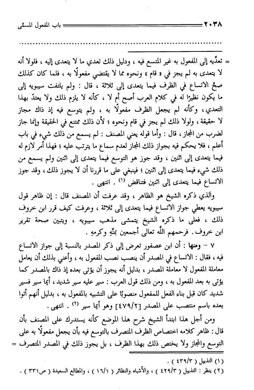 7 - ومنها: أن ابن عصفور تعرض إلى ذكر المصدر بالنسبة إلى جواز الاتساع فيه، فقال: الاتساع في المصدر أن ينصب نصب المفعول به، وأعني بذلك أن يعامل معاملة المفعول لا معاملة المصدر، بدليل أنه يجوز أن يؤتى بعده إذ ذاك بالمصدر كما يؤتى به بعد المفعول به، ومن ذلك قول العرب: سير عليه سير شديد، أيما سير فسير شديد كان قبل بناء الفعل للمفعول منصوبا على التشبيه بالمفعول به، بدليل أنهم أتوا بعده باسم منتصب على المصدر [2/ 479] وهو أيما سير (¬2). انتهى.