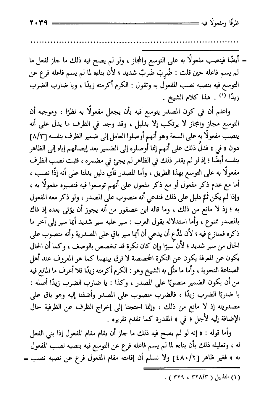 واعلم أن في كون المصدر يتوسع فيه بأن يجعل مفعولا به نظرا، وموجبه أن التوسع مجاز والمجاز لا يرتكب إلا بدليل، وقد وجد في الظرف ما يدل على أنه ينصب مفعولا به على السعة وهو أنهم أوصلوا العامل إلى ضمير الظرف بنفسه [3/ 8] دون «في» فدلّ ذلك على أنهم إنما أوصلوه إلى الضمير بعد إيصالهم إياه إلى الظاهر بنفسه أيضا؛ إذ لو لم يقدر ذلك في الظاهر لم يجئ في مضمره، فثبت نصب الظرف مفعولا به على التوسع بهذا الطريق، وأما المصدر فأي دليل يدلنا على أنه إذا نصب، أما مع عدم ذكر مفعول أو مع ذكر مفعول على أنهم توسعوا فيه فنصبوه مفعولا به، وإذا لم يكن ثمّ دليل على ذلك فندعي أنه منصوب على المصدر، ولو ذكر معه المفعول به؛ إذ لا مانع من ذلك، وما قاله ابن عصفور من أنه يجوز أن يؤتى بعده إذ ذاك بالمصدر ممنوع، وأما استدلاله بقول العرب: سير عليه سير شديد أيما سير إلى آخر ما ذكره فمنازع فيه؛ لأن لمدّع أن يدعي أن أيما سير باق على المصدرية وأنه منصوب على الحال من سير شديد؛ لأن سيرا وإن كان نكرة قد تخصص بالوصف، وكما أن الحال يكون عن المعرفة يكون عن النكرة المخصصة لا فرق بينهما كما هو المعروف عند أهل الصناعة النحوية، وأما ما مثّل به الشيخ وهو: الكرم أكرمته زيدا فلا أعرف ما المانع فيه من أن يكون الضمير منصوبا على المصدر، وكذا: يا ضارب الضرب زيدا أصله: