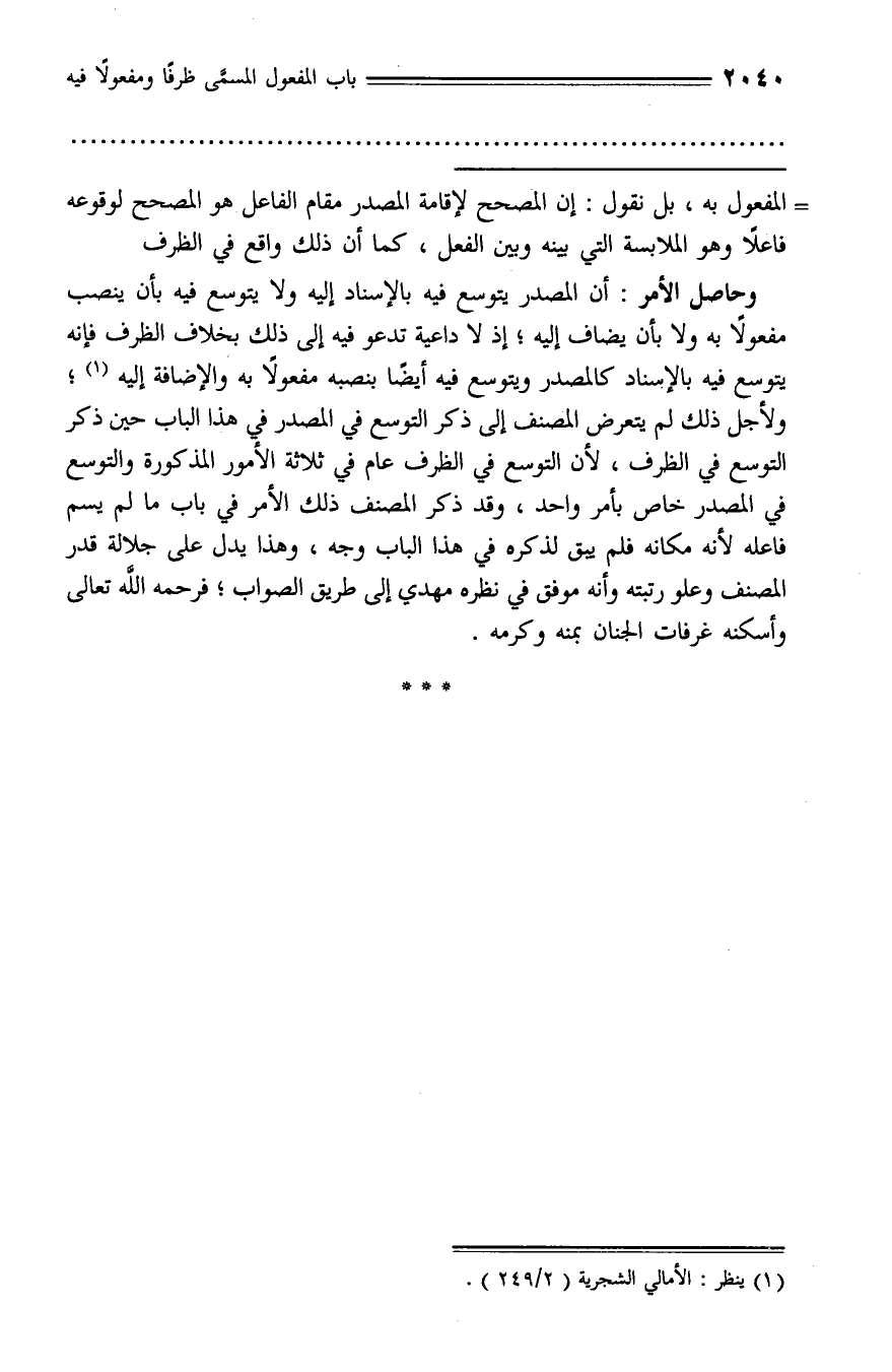والإضافة إليه (¬1)؛ ولأجل ذلك لم يتعرض المصنف إلى ذكر التوسع في المصدر في هذا الباب حين ذكر التوسع في الظرف، لأن التوسع في الظرف عام في ثلاثة الأمور المذكورة والتوسع في المصدر خاص بأمر واحد، وقد ذكر المصنف ذلك الأمر في باب ما لم يسم فاعله لأنه مكانه فلم يبق لذكره في هذا الباب وجه، وهذا يدل على جلالة قدر المصنف وعلو رتبته وأنه موفق في نظره مهدي إلى طريق الصواب؛ فرحمه الله تعالى وأسكنه غرفات الجنان بمنه وكرمه.