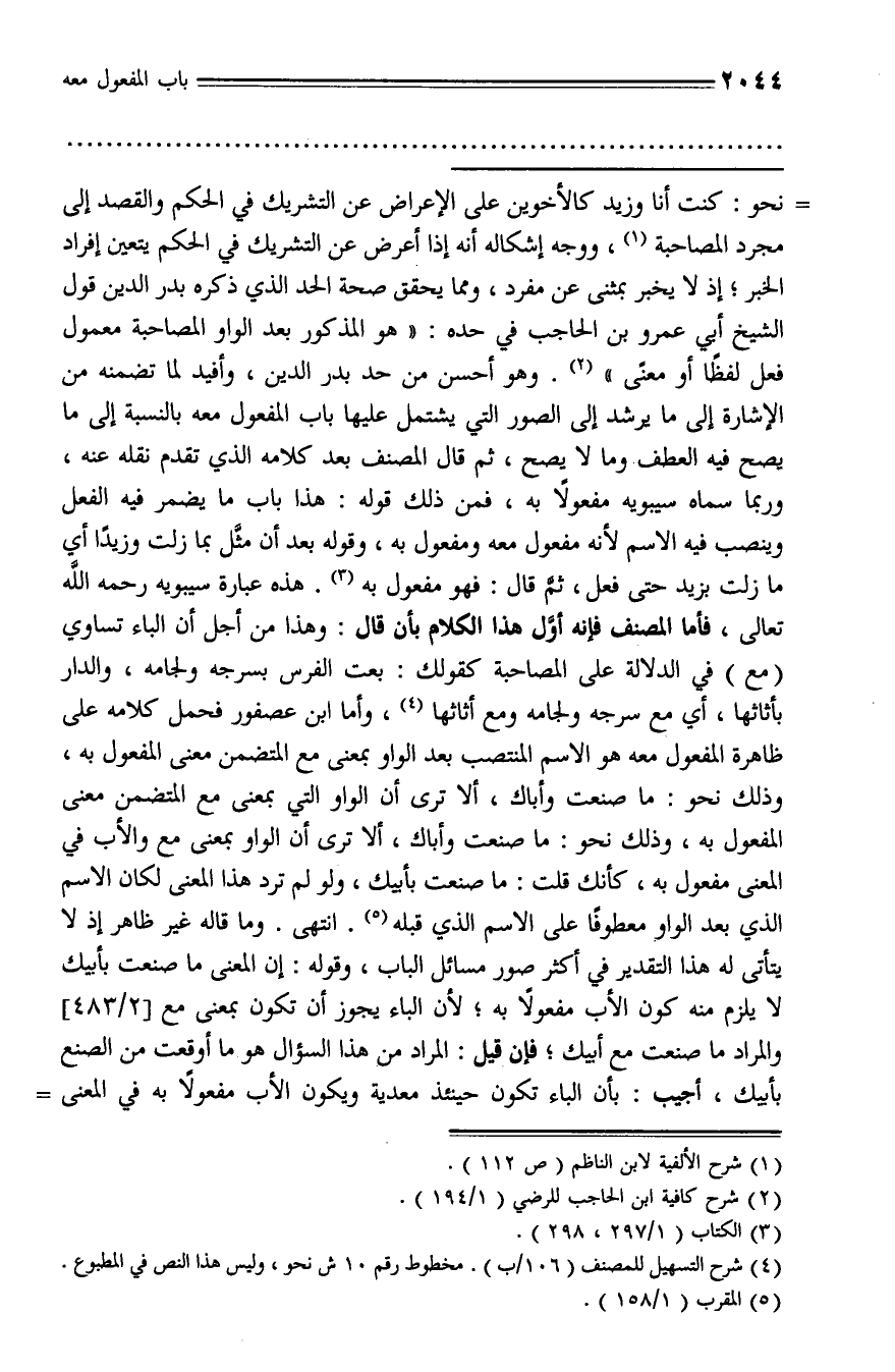 نحو: كنت أنا وزيد كالأخوين على الإعراض عن التشريك في الحكم والقصد إلى مجرد المصاحبة (¬1)، ووجه إشكاله أنه إذا أعرض عن التشريك في الحكم يتعين إفراد الخبر؛ إذ لا يخبر بمثنى عن مفرد، ومما يحقق صحة الحد الذي ذكره بدر الدين قول الشيخ أبي عمرو بن الحاجب في حده: «هو المذكور بعد الواو المصاحبة معمول فعل لفظا أو معنى» (¬2). وهو أحسن من حد بدر الدين، وأفيد لما تضمنه من الإشارة إلى ما يرشد إلى الصور التي يشتمل عليها باب المفعول معه بالنسبة إلى ما يصح فيه العطف وما لا يصح، ثم قال المصنف بعد كلامه الذي تقدم نقله عنه، وربما سماه سيبويه مفعولا به، فمن ذلك قوله: هذا باب ما يضمر فيه الفعل وينصب فيه الاسم لأنه مفعول معه ومفعول به، وقوله بعد أن مثّل بما زلت وزيدا أي ما زلت بزيد حتى فعل، ثمّ قال: فهو مفعول به (¬3). هذه عبارة سيبويه رحمه الله تعالى، فأما المصنف فإنه أوّل هذا الكلام بأن قال: وهذا من أجل أن الباء تساوي (مع) في الدلالة على المصاحبة كقولك: بعت الفرس بسرجه ولجامه، والدار بأثاثها، أي مع سرجه ولجامه ومع أثاثها (¬4)، وأما ابن عصفور فحمل كلامه على ظاهرة المفعول معه هو الاسم المنتصب بعد الواو بمعنى مع المتضمن معنى المفعول به، وذلك نحو: ما صنعت وأباك، ألا ترى أن الواو التي بمعنى مع المتضمن معنى المفعول به، وذلك نحو: ما صنعت وأباك، ألا ترى أن الواو بمعنى مع والأب في المعنى مفعول به، كأنك قلت: ما صنعت بأبيك، ولو لم ترد هذا المعنى لكان الاسم الذي بعد الواو معطوفا على الاسم الذي قبله (¬5). انتهى. وما قاله غير ظاهر إذ لا يتأتى له هذا التقدير في أكثر صور مسائل الباب، وقوله: إن المعنى ما صنعت بأبيك لا يلزم منه كون الأب مفعولا به؛ لأن الباء يجوز أن تكون بمعنى مع [2/ 483] والمراد ما صنعت مع أبيك؛ فإن قيل: المراد من هذا السؤال هو ما أوقعت من الصنع بأبيك، أجيب: بأن الباء تكون حينئذ معدية ويكون الأب مفعولا به في المعنى -