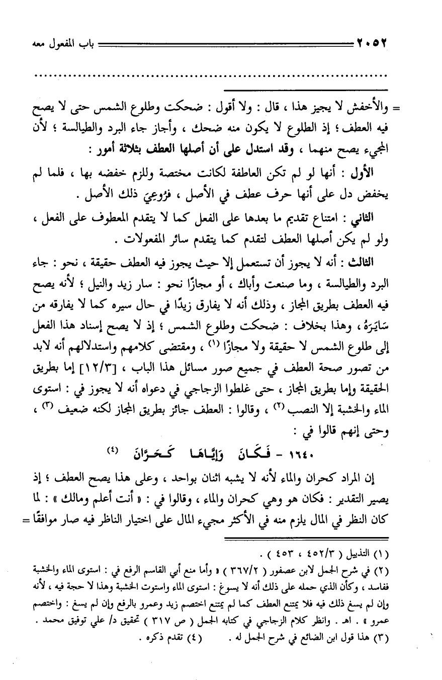 الثالث: أنه لا يجوز أن تستعمل إلا حيث يجوز فيه العطف حقيقة، نحو: جاء البرد والطيالسة، وما صنعت وأباك، أو مجازا نحو: سار زيد والنيل؛ لأنه يصح فيه العطف بطريق المجاز، وذلك أنه لا يفارق زيدا في حال سيره كما لا يفارقه من سايره، وهذا بخلاف: ضحكت وطلوع الشمس؛ إذ لا يصح إسناد هذا الفعل إلى طلوع الشمس لا حقيقة ولا مجازا (¬1)، ومقتضى كلامهم واستدلالهم أنه لابد من تصور صحة العطف في جميع صور مسائل هذا الباب، [3/ 12] إما بطريق الحقيقة وإما بطريق المجاز، حتى غلطوا الزجاجي في دعواه أنه لا يجوز في: استوى الماء والخشبة إلا النصب (¬2)، وقالوا: العطف جائز بطريق المجاز لكنه ضعيف (¬3)، وحتى إنهم قالوا في: