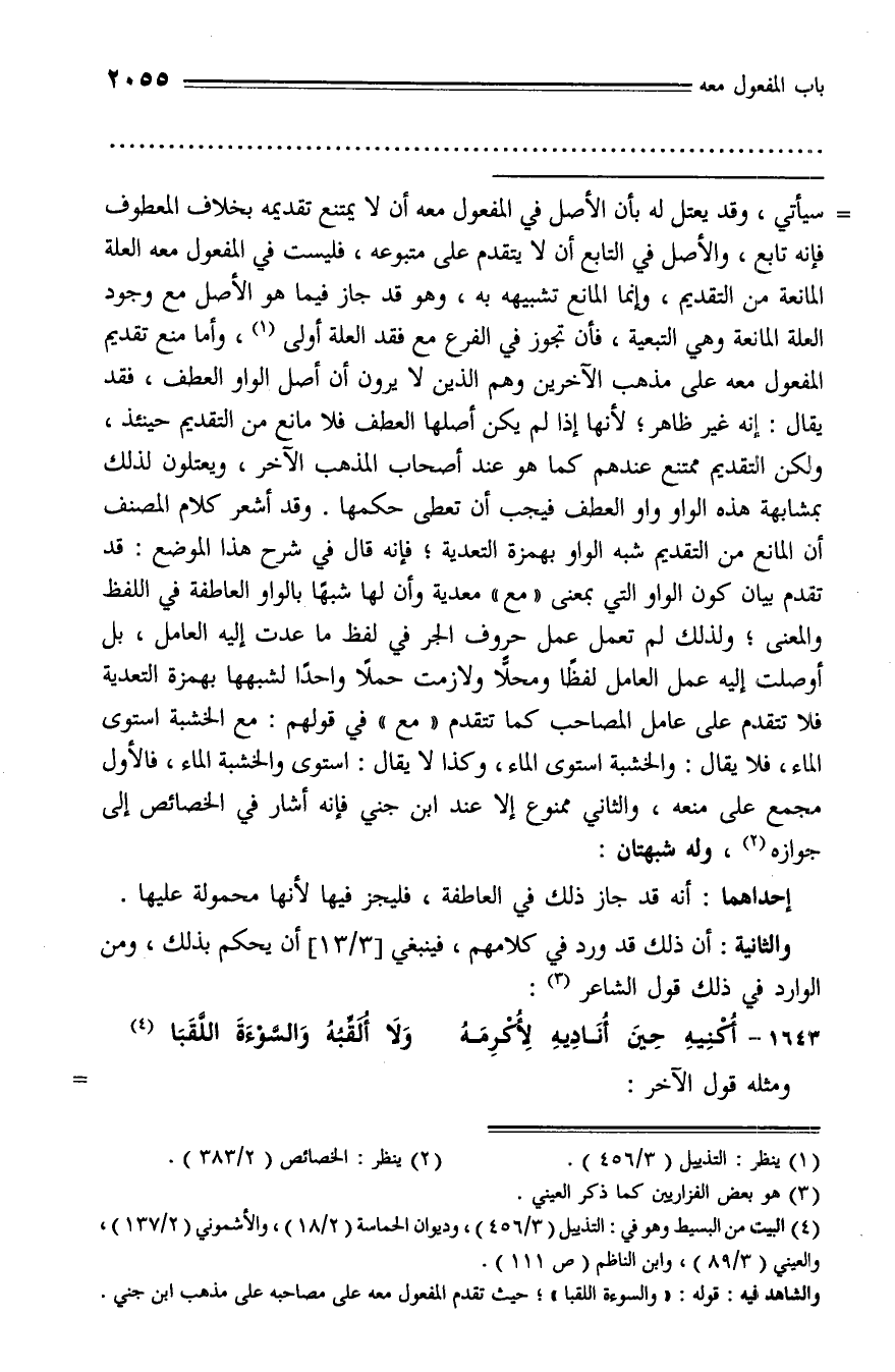 سيأتي، وقد يعتل له بأن الأصل في المفعول معه أن لا يمتنع تقديمه بخلاف المعطوف فإنه تابع، والأصل في التابع أن لا يتقدم على متبوعه، فليست في المفعول معه العلة المانعة من التقديم، وإنما المانع تشبيهه به، وهو قد جاز فيما هو الأصل مع وجود العلة المانعة وهي التبعية، فأن تجوز في الفرع مع فقد العلة أولى (¬1)، وأما منع تقديم المفعول معه على مذهب الآخرين وهم الذين لا يرون أن أصل الواو العطف، فقد يقال: إنه غير ظاهر؛ لأنها إذا لم يكن أصلها العطف فلا مانع من التقديم حينئذ، ولكن التقديم ممتنع عندهم كما هو عند أصحاب المذهب الآخر، ويعتلون لذلك بمشابهة هذه الواو واو العطف فيجب أن تعطى حكمها. وقد أشعر كلام المصنف أن المانع من التقديم شبه الواو بهمزة التعدية؛ فإنه قال في شرح هذا الموضع: قد تقدم بيان كون الواو التي بمعنى «مع» معدية وأن لها شبها بالواو العاطفة في اللفظ والمعنى؛ ولذلك لم تعمل عمل حروف الجر في لفظ ما عدت إليه العامل، بل أوصلت إليه عمل العامل لفظا ومحلّا ولازمت حملا واحدا لشبهها بهمزة التعدية فلا تتقدم على عامل المصاحب كما تتقدم «مع» في قولهم: مع الخشبة استوى الماء، فلا يقال: والخشبة استوى الماء، وكذا لا يقال: