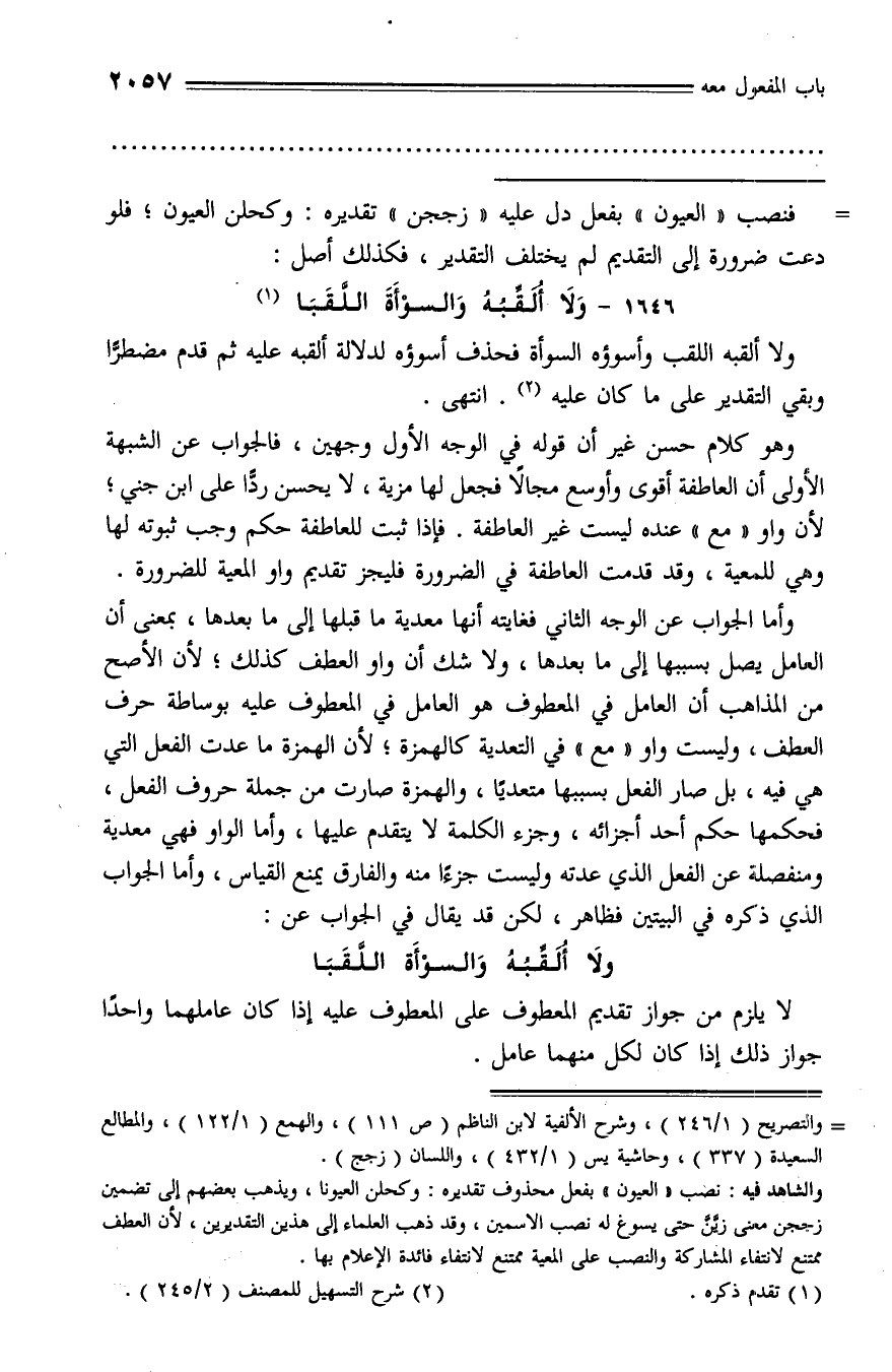 ولا شك أن واو العطف كذلك؛ لأن الأصح من المذاهب أن العامل في المعطوف هو العامل في المعطوف عليه بوساطة حرف العطف، وليست واو «مع» في التعدية كالهمزة؛ لأن الهمزة ما عدت الفعل التي هي فيه، بل صار الفعل بسببها متعديا، والهمزة صارت من جملة حروف الفعل، فحكمها حكم أحد أجزائه، وجزء الكلمة لا يتقدم عليها، وأما الواو فهي معدية ومنفصلة عن الفعل الذي عدته وليست جزءا منه والفارق يمنع القياس، وأما الجواب الذي ذكره في البيتين فظاهر، لكن قد يقال في الجواب عن: