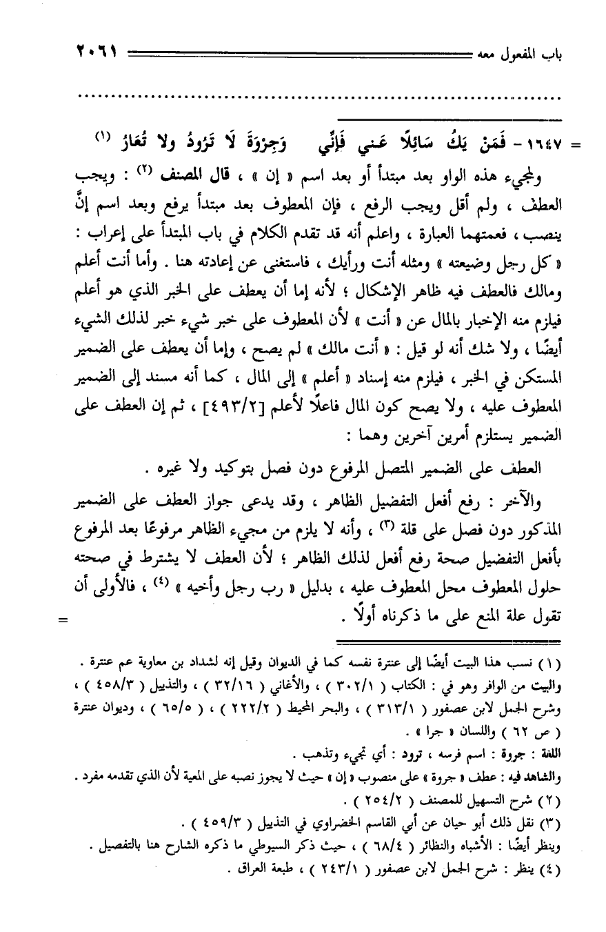 والشاهد فيه: عطف «جروة» على منصوب «إن» حيث لا يجوز نصبه على المعية لأن الذي تقدمه مفرد.
