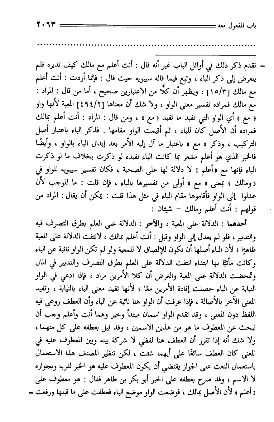 مع مالك فمراده تفسير معنى الواو، ولا شك أن معناها [2/ 494] المعية لأنها واو «مع» أي الواو التي تفيد ما تفيد «مع»، ومن قال: المراد: أنت أعلم بمالك فمراده أن الأصل كان للباء، ثم أقيمت الواو مقامها. فذكر الباء باعتبار أصل التركيب، وذكر «مع» باعتبار ما آل إليه الأمر بعد إبدال الباء بالواو، وأيضا فالخبر الذي هو أعلم مشعر بما كانت الباء تفيده لو ذكرت بخلاف ما لو ذكرت الباء فإنها مع «أعلم» لا دلالة لها على الصحبة، فكان تفسير سيبويه للواو في «ومالك» بمعنى «مع» أولى من تفسيرها بالباء، فإن قلت: ما الموجب لأن عدلوا إلى الواو فأقاموها مقام الباء في مثل هذا قلت: يمكن أن يقال: المراد من قولهم: أنت أعلم ومالك - شيئان: