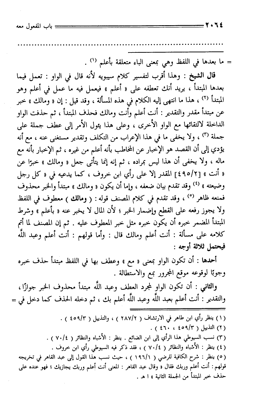 قال الشيخ: وهذا أقرب لتفسير كلام سيبويه لأنه قال في الواو: تعمل فيما بعدها المبتدأ، يريد أنك تعطفه على «أعلم» فيعمل فيه ما عمل في أعلم وهو المبتدأ (¬2)، هذا ما انتهى إليه الكلام في هذه المسألة، وقد قيل: إن «ومالك» خبر عن مبتدأ مقدر والتقدير: أنت أعلم وأنت ومالك فحذف المبتدأ، ثم حذفت الواو الداخلة لالتقائها مع الواو الأخرى، وعلى هذا يئول الأمر إلى عطف جملة على جملة (¬3)، ولا يخفى ما في هذا الإعراب من التكلف وتقدير مستغنى عنه، مع أنه يؤدي إلى أن القصد هو الإخبار عن المخاطب بأنه أعلم من غيره، ثم الإخبار بأنه مع ماله، ولا يخفى أن هذا ليس بمراده، ثم إنه إنما يتأتى جعل «ومالك» خبرا عن «أنت» [2/ 495] المقدر إلا على رأي ابن خروف، كما يدعيه في «كل رجل وضيعته» (¬4) وقد تقدم بيان ضعفه، وإما أن يكون «ومالك» مبتدأ والخبر محذوف فمنعه ظاهر (¬5)، وقد تقدم في كلام المصنف قوله: (ومالك) معطوف في اللفظ ولا يجوز رفعه على القطع وإضمار الخبر؛ لأن المال لا يخبر عنه «بأعلم» وشرط المبتدأ المضمر خبره أن يكون خبره مثل خبر المعطوف عليه. ثم إن المصنف لما أتم كلامه على مسألة: أنت أعلم ومالك قال: وأما قولهم: أنت أعلم وعبد الله فيحتمل ثلاثة أوجه: