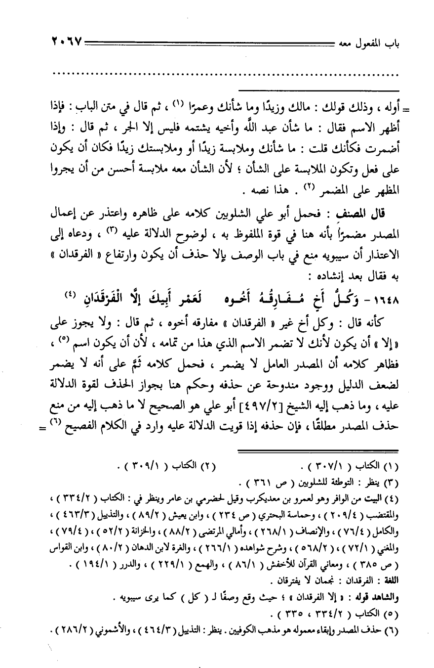 كأنه قال: وكل أخ غير «الفرقدان» مفارقه أخوه، ثم قال: ولا يجوز على «إلا» أن يكون لأنك لا تضمر الاسم الذي هذا من تمامه، لأن أن يكون اسم (¬5)، فظاهر كلامه أن المصدر العامل لا يضمر، فحمل كلامه ثمّ على أنه لا يضمر لضعف الدليل ووجود مندوحة عن حذفه وحكم هنا بجواز الحذف لقوة الدلالة عليه، وما ذهب إليه الشيخ [2/ 497] أبو علي هو الصحيح لا ما ذهب إليه من منع حذف المصدر مطلقا، فإن حذفه إذا قويت الدلالة عليه وارد في الكلام الفصيح (¬6) -
