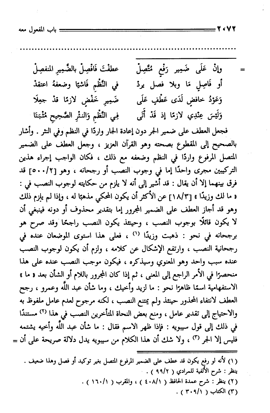 فجعل العطف على ضمير الجر دون إعادة الجار واردا في النظم وفي النثر. وأشار بالصحيح إلى المقطوع بصحته وهو القرآن العزيز، وجعل العطف على الضمير المتصل المرفوع واردا في النظم وضعفه مع ذلك، فكان الواجب إجراء هذين التركيبين مجرى واحدا إما في وجوب النصب أو رجحانه، وهو [2/ 500] قد فرق بينهما إلا أن يقال: قد أشير إلى أنه لا يلزم من حكايته لوجوب النصب في: