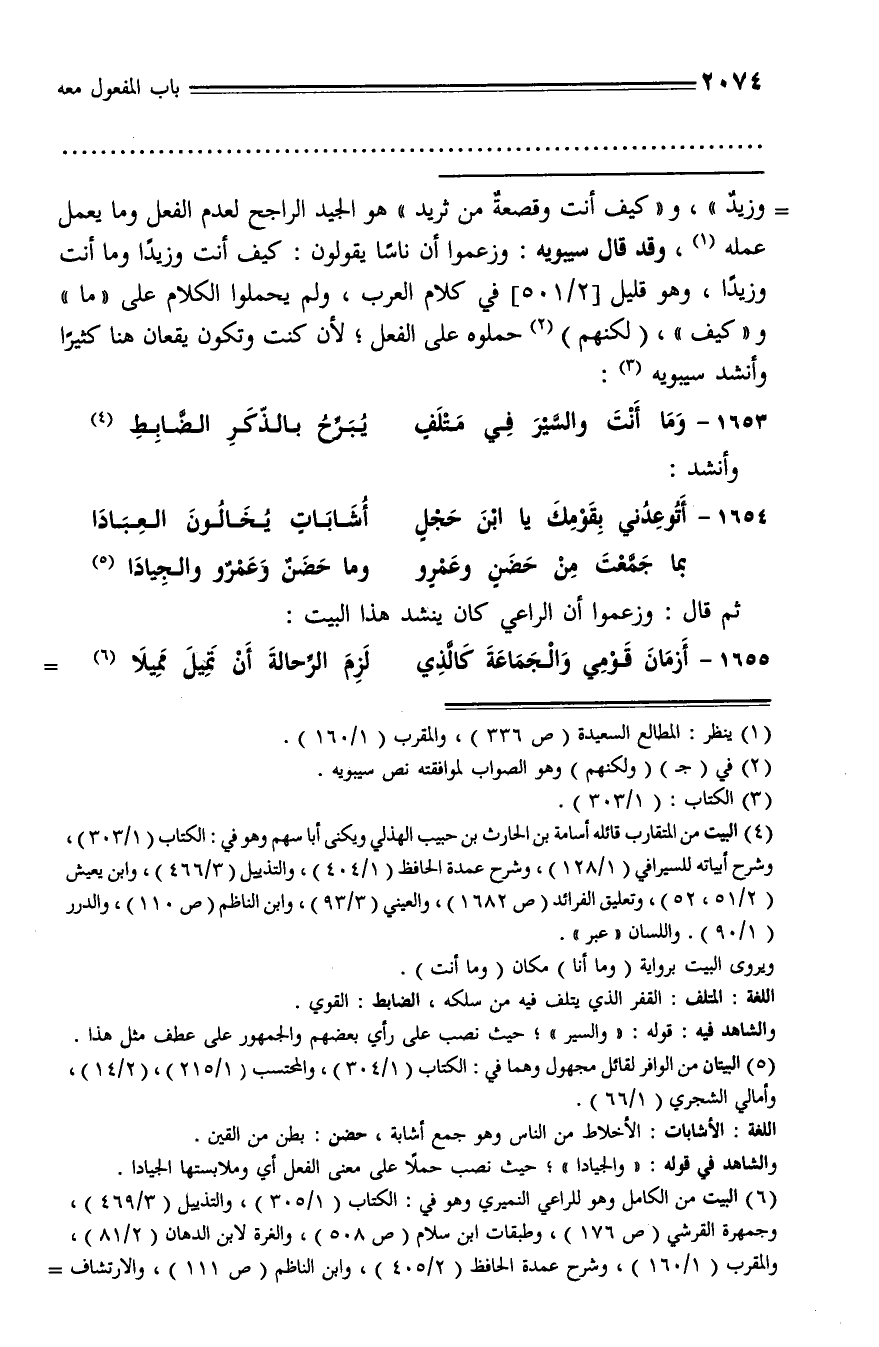 وزيد»، و «كيف أنت وقصعة من ثريد» هو الجيد الراجح لعدم الفعل وما يعمل عمله (¬1)، وقد قال سيبويه: وزعموا أن ناسا يقولون: كيف أنت وزيدا وما أنت وزيدا، وهو قليل [2/ 501] في كلام العرب، ولم يحملوا الكلام على «ما» و «كيف»، (لكنهم) (¬2) حملوه على الفعل؛ لأن كنت وتكون يقعان هنا كثيرا وأنشد سيبويه (¬3):