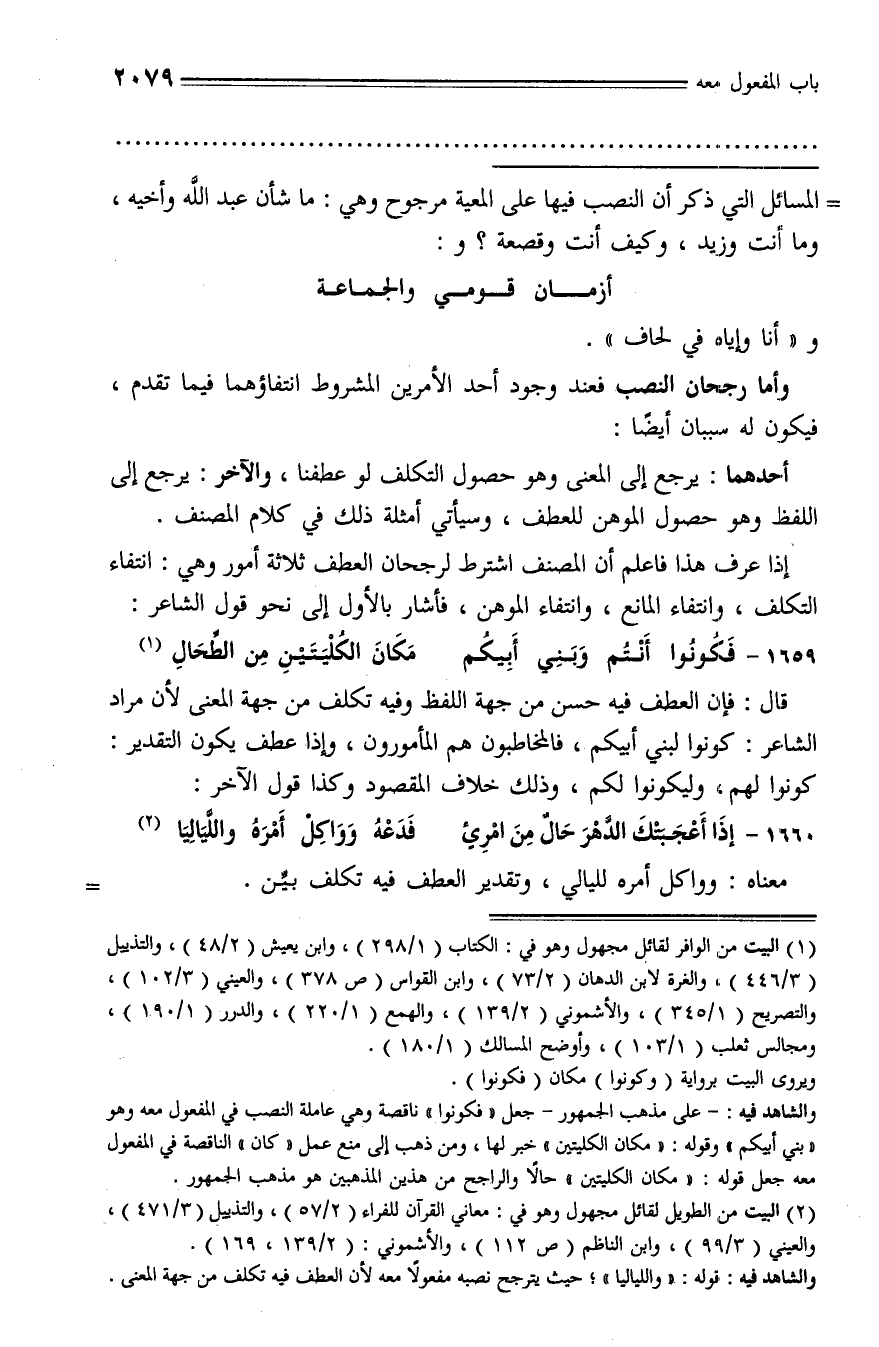 والشاهد فيه: - على مذهب الجمهور - جعل «فكونوا» ناقصة وهي عاملة النصب في المفعول معه وهو «بني أبيكم» وقوله: «مكان الكليتين» خبر لها، ومن ذهب إلى منع عمل «كان» الناقصة في المفعول معه جعل قوله: «مكان الكليتين» حالا والراجح من هذين المذهبين هو مذهب الجمهور.