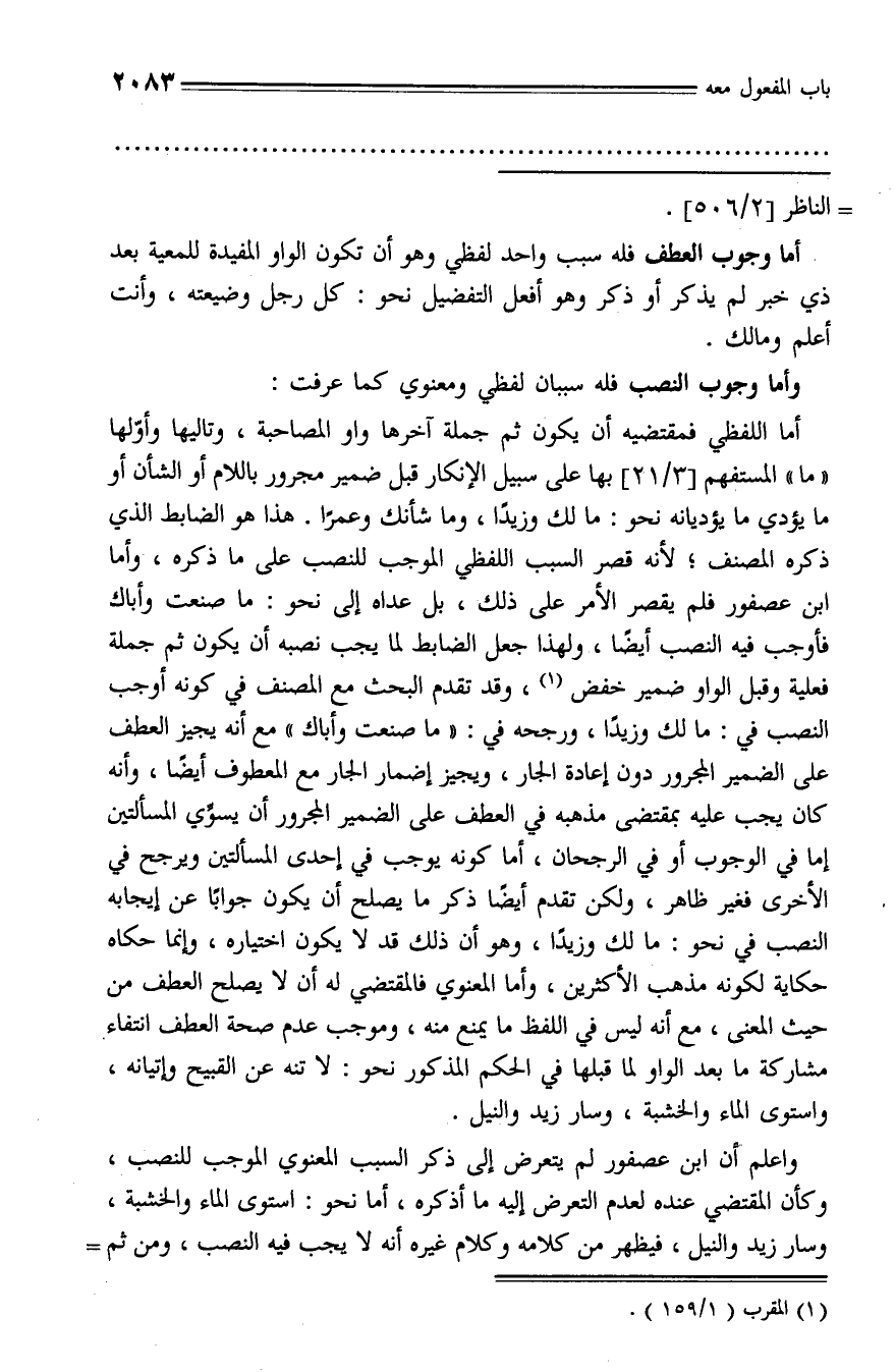 ظاهر، ولكن تقدم أيضا ذكر ما يصلح أن يكون جوابا عن إيجابه النصب في نحو: ما لك وزيدا، وهو أن ذلك قد لا يكون اختياره، وإنما حكاه حكاية لكونه مذهب الأكثرين، وأما المعنوي فالمقتضي له أن لا يصلح العطف من حيث المعنى، مع أنه ليس في اللفظ ما يمنع منه، وموجب عدم صحة العطف انتفاء مشاركة ما بعد الواو لما قبلها في الحكم المذكور نحو: لا تنه عن القبيح وإتيانه، واستوى الماء والخشبة، وسار زيد والنيل.