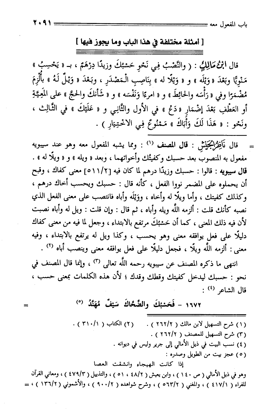 قال ابن مالك: (والنّصب في نحو حسبك وزيدا درهم، بـ «يحسب» منويّا وبعد «ويله» و «ويلا له» بناصب المصدر، وبعد «ويل له» بألزم مضمرا وفي «رأسه والحائط» و «امرءا ونفسه» و «شأنك والحجّ» على المعيّة أو العطف بعد إضمار «دع» في الأول والثّاني و «عليك» في الثّالث، ونحو: «هذا لك وأباك» ممنوع في الاختيار).