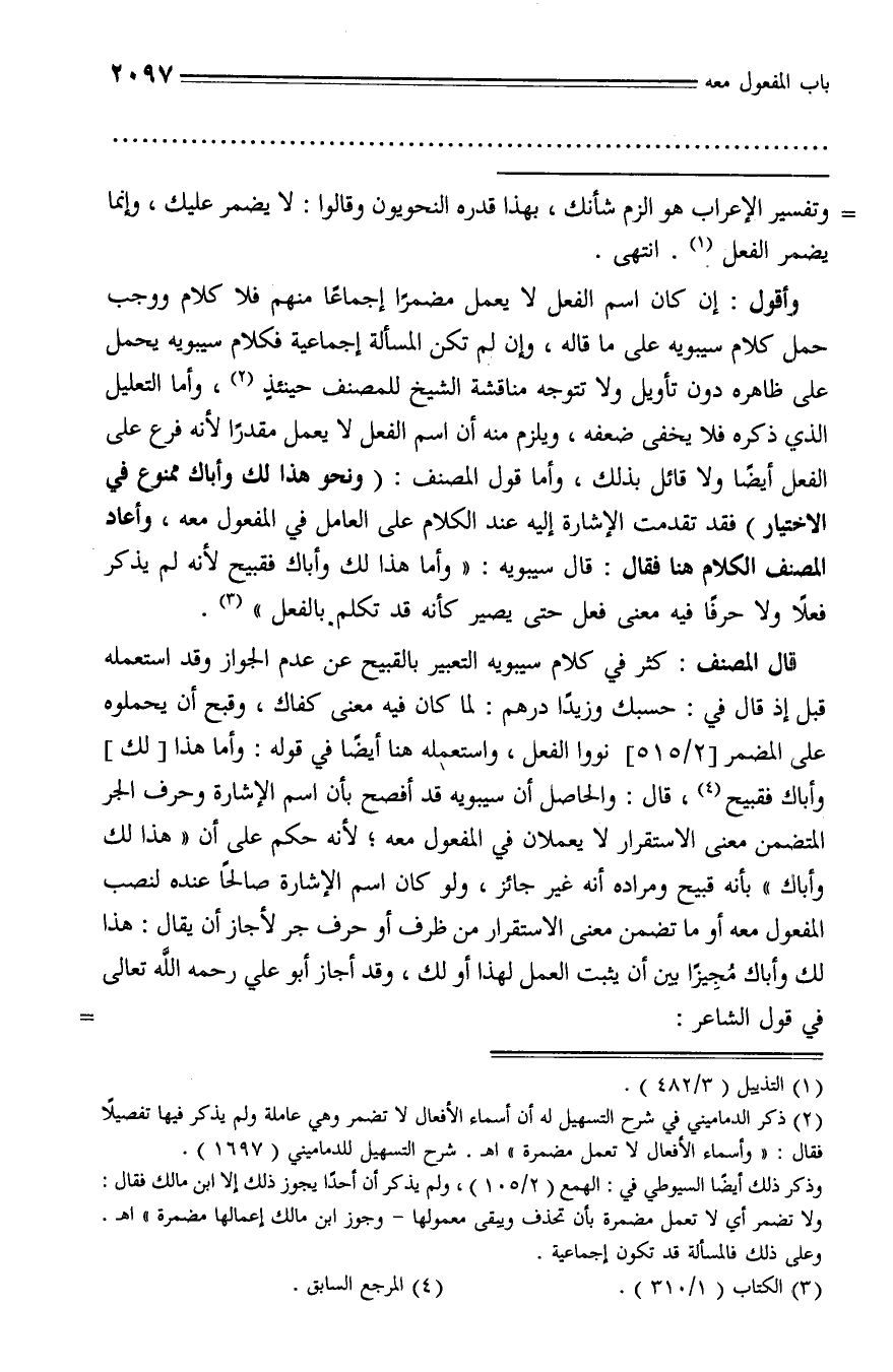 وأقول: إن كان اسم الفعل لا يعمل مضمرا إجماعا منهم فلا كلام ووجب حمل كلام سيبويه على ما قاله، وإن لم تكن المسألة إجماعية فكلام سيبويه يحمل على ظاهره دون تأويل ولا تتوجه مناقشة الشيخ للمصنف حينئذ (¬2)، وأما التعليل الذي ذكره فلا يخفى ضعفه، ويلزم منه أن اسم الفعل لا يعمل مقدرا لأنه فرع على الفعل أيضا ولا قائل بذلك، وأما قول المصنف: (ونحو هذا لك وأباك ممنوع في الاختيار) فقد تقدمت الإشارة إليه عند الكلام على العامل في المفعول معه، وأعاد المصنف الكلام هنا فقال: قال سيبويه: «وأما هذا لك وأباك فقبيح لأنه لم يذكر فعلا ولا حرفا فيه معنى فعل حتى يصير كأنه قد تكلم بالفعل» (¬3).