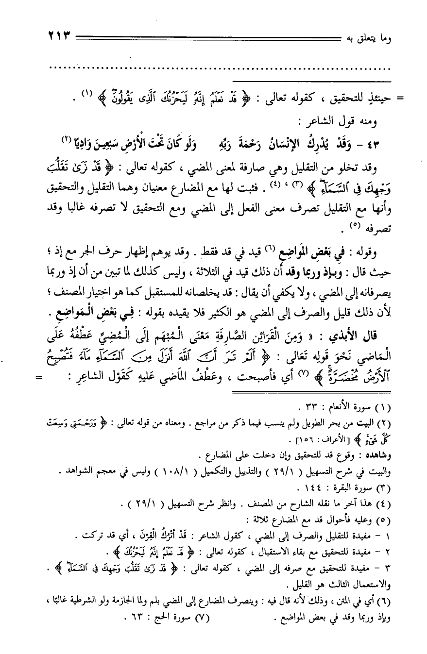 وقد تخلو من التقليل وهي صارفة لمعنى المضي، كقوله تعالى: قَدْ نَرى تَقَلُّبَ وَجْهِكَ فِي السَّماءِ (¬3)، (¬4). فثبت لها مع المضارع معنيان وهما التقليل والتحقيق وأنها مع التقليل تصرف معنى الفعل إلى المضي ومع التحقيق لا تصرفه غالبا وقد تصرفه (¬5).