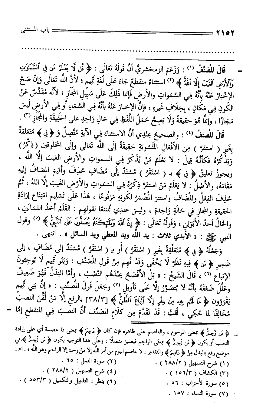 قال المصنّف (¬1): وزعم الزمخشريّ أنّ قوله تعالى: قُلْ لا يَعْلَمُ مَنْ فِي السَّماواتِ وَالْأَرْضِ الْغَيْبَ إِلَّا اللَّهُ (¬2) استثناء منقطع جاء على لغة تميم؛ لأنّ الله تعالى وإن صحّ الإخبار عنه بأنّه في السّموات والأرض فإنما ذلك على سبيل المجاز؛ لأنّه مقدّس عن الكون في مكان، بخلاف غيره، فإنّ الإخبار عنه بأنّه في السّماء أو في الأرض ليس مجازا، وإنمّا هو حقيقة ولا يصحّ حمل اللّفظ في حال واحد على الحقيقة والمجاز (¬3).