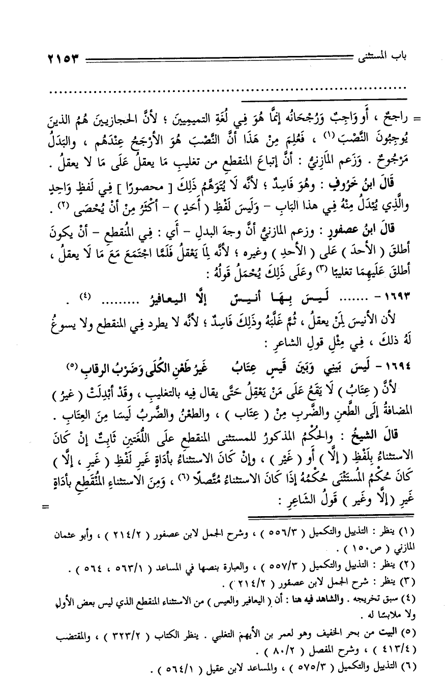 (¬4) سبق تخريجه. والشاهد فيه هنا: أن (اليعافير والعيس) من الاستثناء المنقطع الذي ليس بعض الأول ولا ملابسا له.