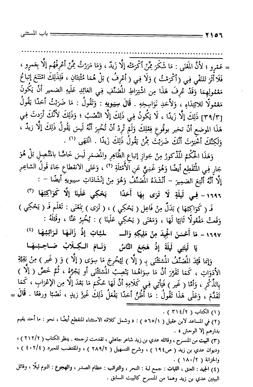 (¬2) في المساعد لابن عقيل (1/ 565): «وشمل كلامه الاستثناء المنقطع أيضا، نحو: ما أحد يقيم بدارهم إلا الوحش».