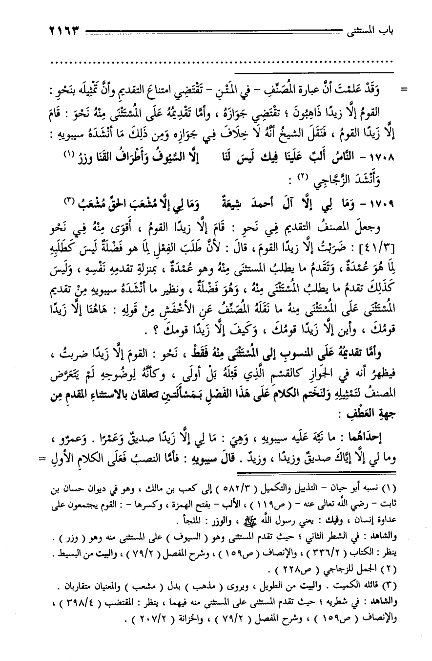 القوم إلّا زيدا ذاهبون؛ تقتضي جوازه، وأمّا تقديمه على المستثنى منه نحو: قام إلّا زيدا القوم، فنقل الشيخ أنّه لا خلاف في جوازه ومن ذلك ما أنشده سيبويه: