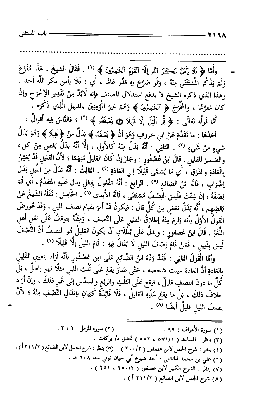 وأمّا القول الثاني: فقد ردّه ابن الضّائع على ابن عصفور بأنّه أراد بتعيين القليل بالعادة أنّ العادة عينت شخصه، حتّى صار يقع على ثلث الليل مثلا فهو باطل، بل كلّ ما دون النصف قليل، فيقع على الثلث والربع والسدس إلى غير ذلك، وإن أراد خلاف ذلك، بل ما يقع عليه القليل، فلا فائدة كبيان بإبدال النّصف منه؛ لأنّ نصف الليل قليل أيضا (¬8). -