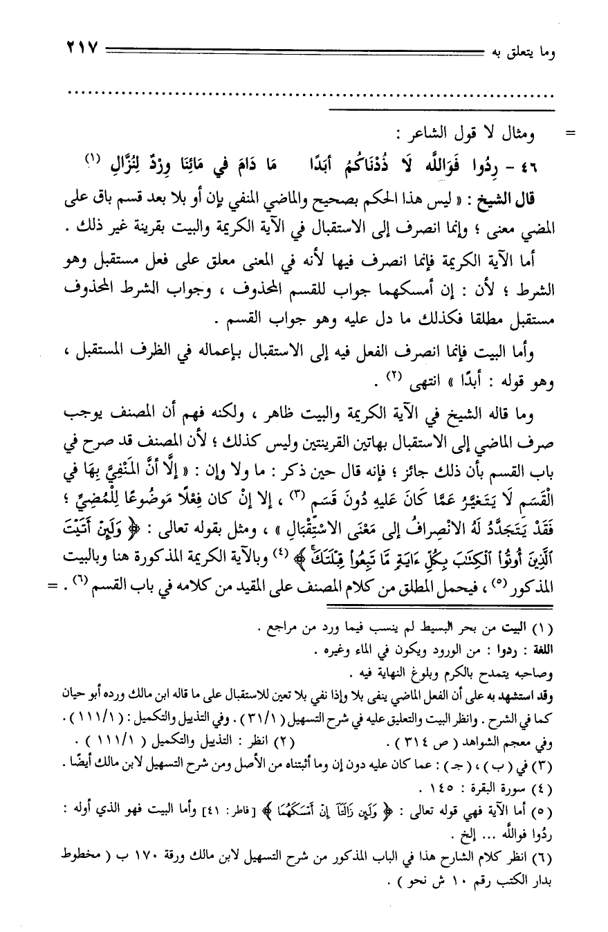 قال الشيخ: «ليس هذا الحكم بصحيح والماضي المنفي بإن أو بلا بعد قسم باق على المضي معنى؛ وإنما انصرف إلى الاستقبال في الآية الكريمة والبيت بقرينة غير ذلك.