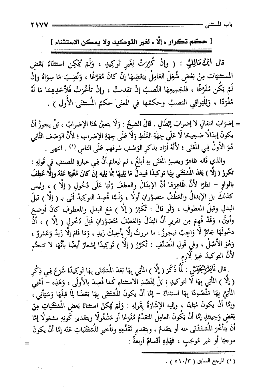 قال ناظر الجيش: لمّا ذكر (إلّا) المأتي بها بعد المستثنى بها توكيدا شرع في ذكر (إلّا) المأتي بها لا لتوكيد؛ بل لقصد الاستثناء كما قصد بالأولى، وهذه - أعني المأتيّ بها مقصودا بها استثناء - إمّا أن يكون المستثنى بها بعضا لما قبلها وسيأتي، وإمّا أن يكون مباينا، وإليه الإشارة بقوله: ولم يمكن استثناء بعض المستثنيات من بعض