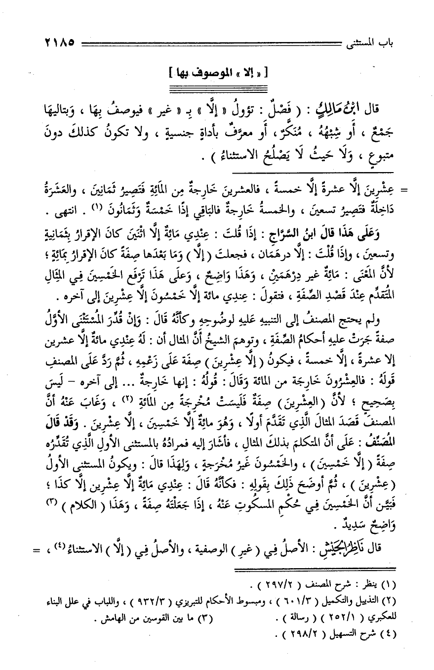 وعلى هذا قال ابن السّرّاج: إذا قلت: عندي مائة إلّا اثنين كان الإقرار بثمانية وتسعين، وإذا قلت: إلّا درهمان، فجعلت (إلّا) وما بعدها صفة كان الإقرار بمائة؛ لأنّ المعنى: مائة غير درهمين، وهذا واضح، وعلى هذا ترفع الخمسين في المثال المتقدّم عند قصد الصّفة، فتقول: عندي مائة إلّا خمسون إلّا عشرين إلى آخره.