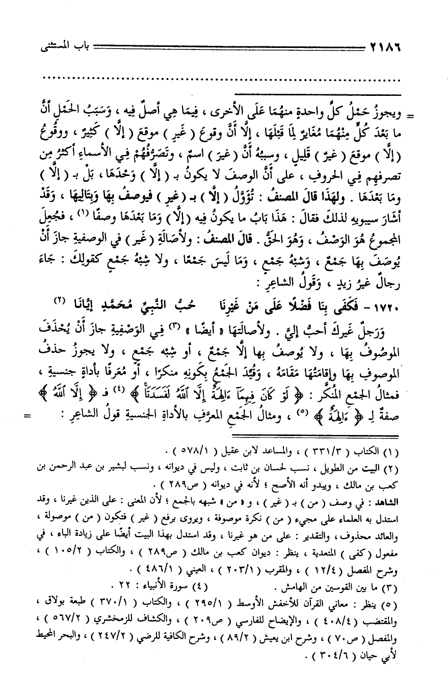 ورجل غيرك أحبّ إليّ. ولأصالتها «أيضا» (¬3) في الوصفية جاز أن يحذف الموصوف بها، ولا يوصف بها إلّا جمع، أو شبه جمع، ولا يجوز حذف الموصوف بها وإقامتها مقامه، وقيّد الجمع بكونه منكرا، أو معرفا بأداة جنسية، فمثال الجمع المنكّر: لَوْ كانَ فِيهِما آلِهَةٌ إِلَّا اللَّهُ لَفَسَدَتا (¬4) فـ إِلَّا اللَّهُ صفة لـ آلِهَةٌ (¬5)، ومثال الجمع المعرّف بالأداة الجنسية قول الشاعر: -