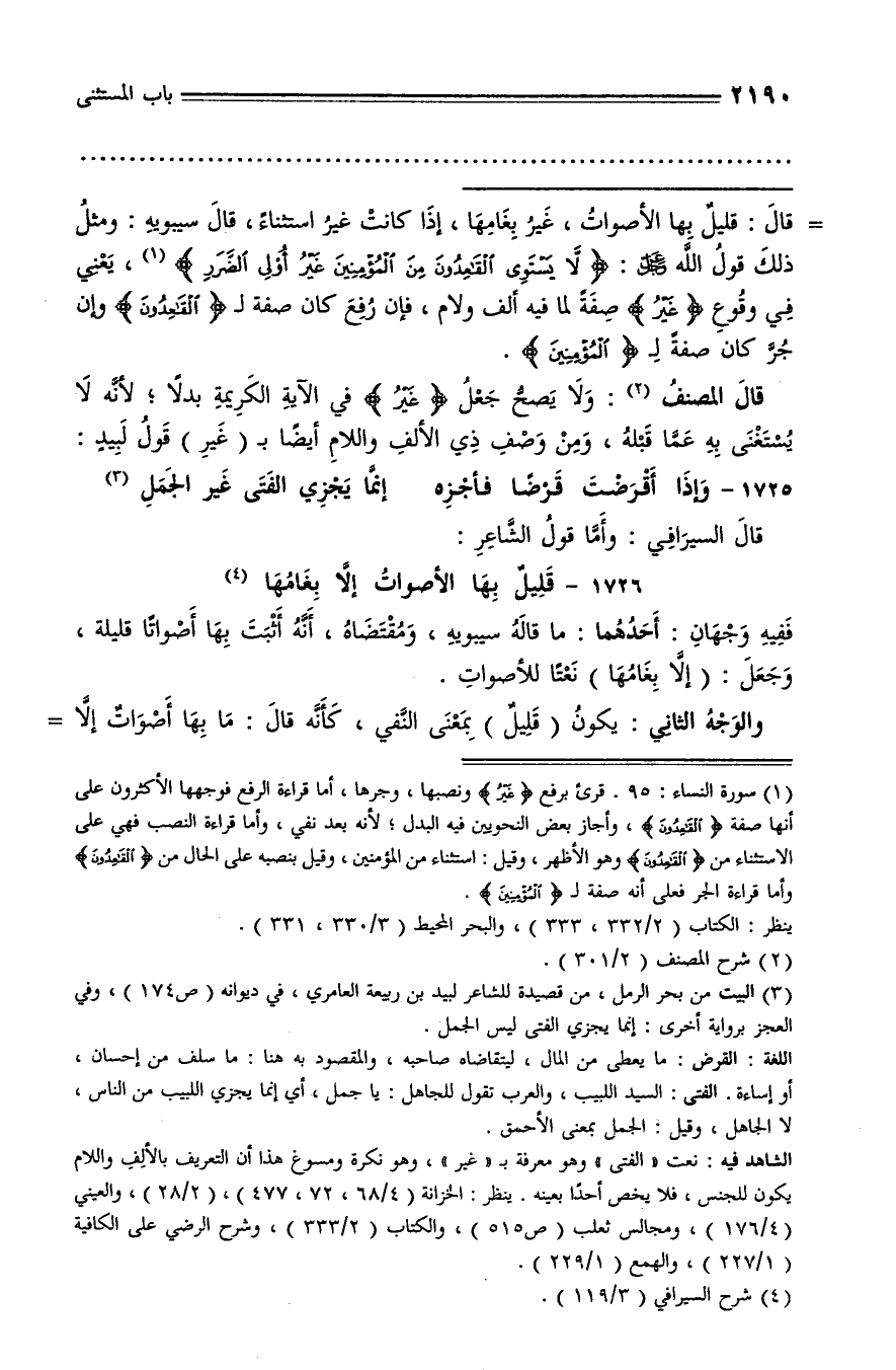 قال: قليل بها الأصوات، غير بغامها، إذا كانت غير استثناء، قال سيبويه: ومثل ذلك قول الله عز وجل: لا يَسْتَوِي الْقاعِدُونَ مِنَ الْمُؤْمِنِينَ غَيْرُ أُولِي الضَّرَرِ (¬1)، يعني في وقوع (غير) صفة لما فيه ألف ولام، فإن رفع كان صفة لـ (القعدون) وإن جرّ كان صفة لـ (المؤمنين.)
