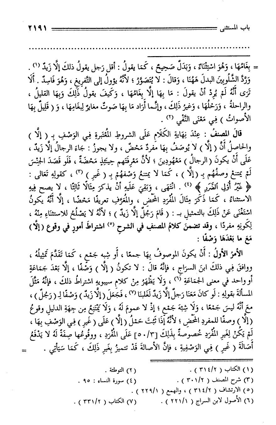 قال المصنف: عند نهاية الكلام على الشروط المعتبرة في الوصف بـ (إلّا) والحاصل أنّ (إلّا) لا يوصف بها مفرد محض، ولا يجوز: جاء الرجال إلّا زيد، على أن يكون (الرجال) معهودين؛ لأنّ معرفتهم حينئذ محضة، فلو قصد الجنس لم يمتنع وصفهم بـ (إلّا)، كما لا يمتنع وصفهم بـ (غير) (¬3)، كقوله تعالى: